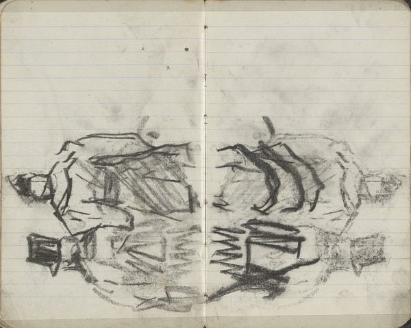 Curator: Welcome. We're standing before George Hendrik Breitner's "Kop van een dier," a head of an animal rendered in pencil on paper, dating from around 1893 to 1894. It’s currently held here at the Rijksmuseum. Editor: It’s…strikingly stark. The heavy, dark pencil strokes contrast sharply with the lined paper, giving it an almost unfinished, urgent feel. A real sketch in the raw. Curator: Breitner, deeply involved in representing modern urban life, often sketched prolifically. His artistic process documented the gritty realities of Amsterdam. It’s compelling to see him engage with animal portraiture. We think this work could have ties to agricultural or industrial animal exploitation debates that were brewing during this period. Editor: Intricate! It feels like peering into the mind of the artist as he’s trying to grasp the very essence of this animal's form, this idea of its headiness and character. I am immediately drawn to the geometric nature of the head—this triangular composition where one form meets another—all reduced into dark shading to abstract the animal in its final rendering. The work takes a complicated form and distills it into something digestible. Curator: Breitner moved fluidly between painting, drawing, and photography. His work invites dialogue about artistic responsibility. He was interested in how animals occupied spaces of modernity that included city farms, for example. Editor: You mention "dialogue," and I'm getting that the contrast, visually, feels so dynamic here—the almost violently scribbled shading next to the delicate, barely-there lines. It's more about the play of form and the *idea* of capturing an animal head than realism, or anything picturesque. The composition and its sharp strokes, capture the essence of animal being reduced by social norms, maybe by industrial needs or restraints—perhaps reflecting the zeitgeist surrounding the urban growth's effects on animal environments? Curator: The politics surrounding this piece invite reflection upon the impact of institutional systems. It causes us to reflect on these political issues regarding social, economic and animal wellbeing at large. Editor: It’s a visual shorthand, hinting at more than it states directly—less about the ‘what’ and more about the ‘how’ we perceive form and mass. Curator: A powerful insight indeed! Editor: It has certainly made me appreciate this artist, so very human and reflective through its unvarnished glimpse into this subject!