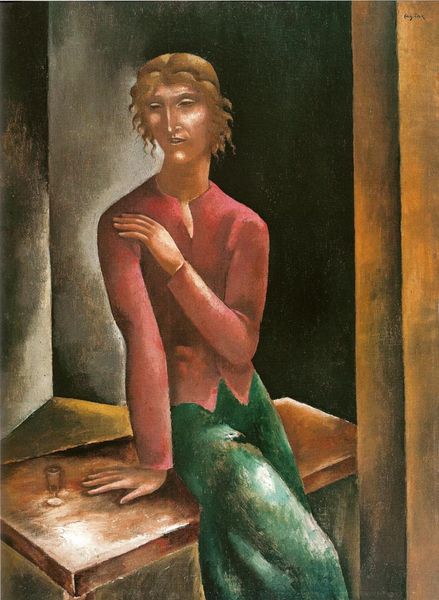 Curator: Welcome. Before us is Philip Evergood's painting from 1942, titled "Commotion," rendered in oil paint. What strikes you upon first viewing this portrait, Editor? Editor: It has a strange melancholy. The heavy industrial shapes behind the figure are oppressive, yet she appears placid, even expectant on those stairs. Curator: Precisely. Observe Evergood’s handling of form. He employs a flattened perspective, pushing the picture plane forward, thereby compressing space and amplifying the symbolic weight of each element—the figure, the staircase, the industrial chimneys. It establishes a tension, wouldn’t you agree? Editor: Absolutely. The tension stems not just from the formal arrangements, but from the sheer materiality. You see how the paint is thickly applied? Almost visceral. It evokes a sense of lived experience, hinting at the labor and environment surrounding the woman in the painting. It emphasizes the reality of making this art. Curator: A cogent point. The application emphasizes the underlying structure of feeling, in line with realist intentions. See how his distorted figures and colors telegraph not photographic realism but, rather, a psychologically charged representation, evocative of early Modernism and specifically the impact of war? Editor: Agreed. But consider further. Oil paints are themselves products, tied to extraction, refinement, industry—mirroring the chimneys in the background, linking subject, object, and medium. Also, observe that the stairs are at an angle, inviting us, maybe forcing us into the setting of a painted stage of industry where lives are made. Curator: You read the elements well, focusing on these key indicators and providing important social context to his aesthetic choices and to what he signifies. Evergood positions us as active interpreters of modern life and its social underpinnings. The woman acts as a mediating figure, a linchpin between the interior, private world and the monumental scale of industry. Editor: Her materiality implicates and asks us to rethink the space that women navigate between labor, commodity and the domestic realm, particularly in 1942 during wartime. Curator: Indeed. Ultimately, this work stands as a powerful visual document, urging viewers to reflect on the psychological toll that social structures exact on individuals. Editor: An effective encounter with labor, materiality, and life intertwined. Thanks.