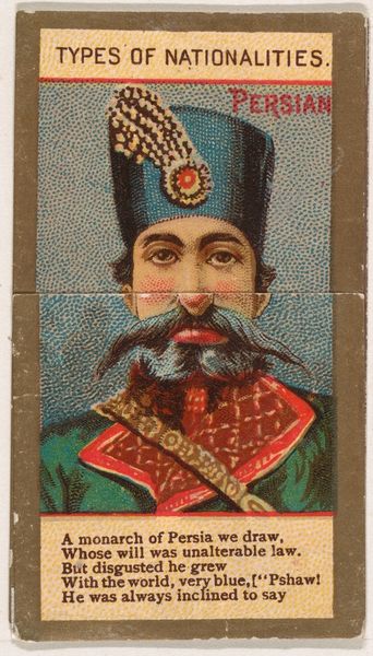 Editor: This small print, titled "Persia, from the International Cards series," was created in 1888 by the Kinney Brothers Tobacco Company. The materials seem to be watercolor and print. The work has an ornamental quality. How should we interpret this piece, situated within its time? Curator: Well, it's critical to recognize that this piece operates within the visual language of Orientalism, a Western approach to depicting "the East" that often exoticizes and simplifies complex realities. How does this image, intended as part of a collectible card series, perpetuate certain ideas about Persia and its ruler? Editor: It feels almost like a caricature, with its emphasis on ornamentation and its simplified portrayal of the Shah. The radiant Lion and Sun symbol adds to the romantic, almost fairytale-like image. Curator: Exactly. Consider who these cards were made for: consumers in the West. The "Persia" represented here is designed to fit Western expectations and desires, reinforcing a power dynamic. It flattens the diversity and complexity of Persian culture into a marketable image. What does it mean when a tobacco company profits from distributing these representations? Editor: It points to the entanglement of commerce, cultural representation, and colonialism. These images were clearly made to sell a product and create a sense of the exotic Other. I hadn’t fully considered how a simple collectible card could carry so much baggage. Curator: Precisely. By understanding these dynamics, we can see how art and visual culture can reinforce power structures and affect perceptions across cultures, and also consider how this card relates to colonial enterprises and trade. Editor: This conversation made me reconsider what it meant to collect them back in the days. It’s fascinating how one small image encapsulates complex issues of representation and power.