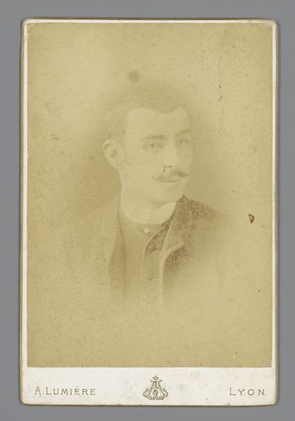 Curator: Let’s discuss this portrait, created between 1885 and 1890 by Mathias Korn. The artwork, titled "Portret van een onbekende man," is an albumen print, a popular photographic process of the time. Editor: He appears stoic, doesn’t he? Perhaps even slightly melancholy. There’s something reserved about the downward cast of his eyes and the tightness of his mouth. Curator: I am struck by how the photographer utilizes the albumen process. Note the soft tonal gradations and how they contribute to the formal composition. The high contrast and subtle blending create a refined effect. Editor: I find myself questioning the power dynamics inherent in portraiture of this era. This is likely a commissioned piece, highlighting the sitter’s access to wealth and the technology of photography, so it seems very much a portrait of bourgeois male identity. Curator: Precisely. This type of portrait became accessible to the rising middle class as photography advanced, which allowed for new methods of memorialization and ways of proclaiming one’s place in society. Notice, too, how the vignetting focuses our attention. The soft blur around the edges forces you to lock eyes with the sitter. Editor: That makes me think about the lack of biographical context—the sitter is simply identified as “an unknown man.” It positions him, and so many others who are never written into the historical record, as spectral figures of that era. A reminder of whose stories get told, and whose remain absent from the archive. Curator: True. Even still, by examining the artistry and structure present here, we gain insights into the societal and cultural values reflected within portraiture of the era. Editor: Yes, and perhaps even more so into who we omit when writing those structures into history. What absences do they illuminate? Curator: That's something to continue considering, thank you. Editor: Of course. It’s all connected, wouldn’t you say?
