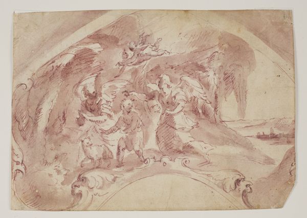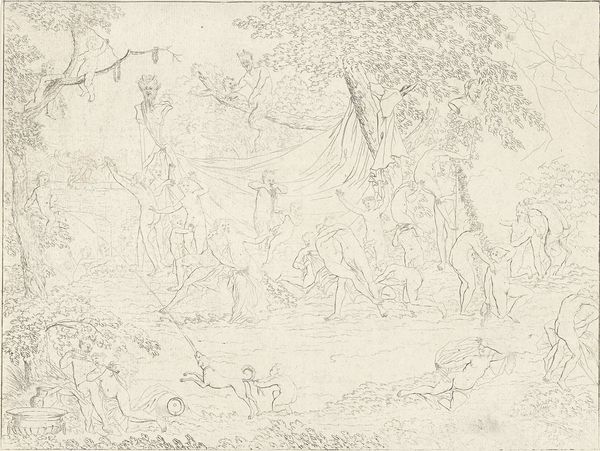 Curator: This is Thomas Stothard's "Design for a Frieze - Boys with a Panther, Putti Bearing Baskets of Flowers, Etc. Below, Rough Sketches of Similar Figures," part of the Tate Collections. Editor: It's airy, full of light, almost a dreamlike composition. The figures seem to float. Curator: Stothard was deeply involved with the artistic and social milieu of his time, this drawing reflects the prevailing neoclassical taste, referencing idealized forms and pastoral scenes favored by the aristocracy. Editor: Yes, but look at the dynamism! The arrangement, the way he's captured the human form—it's all about line and movement. Curator: The sketch also gives us insight into artistic creation, revealing process as an evolution shaped by patron expectations. Editor: I see it more as a celebration of pure artistic expression. Curator: A fine conclusion to a fascinating work. Editor: Indeed, a stimulating exercise for the eye and mind.