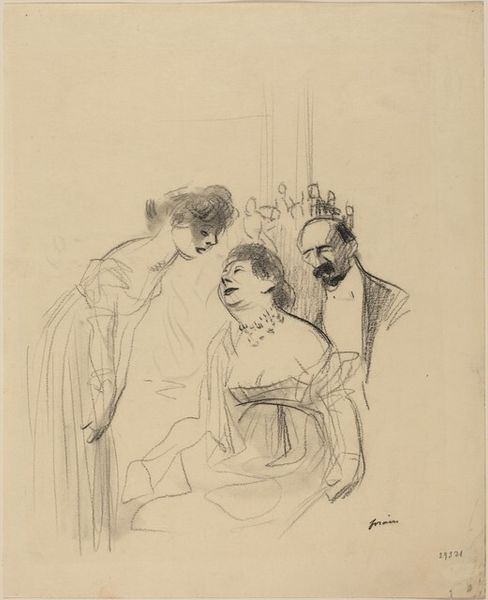 Jean-Louis Forain created "Three Drawings on a Sheet" using graphite, presenting a glimpse into Parisian society through the lens of gender and class dynamics. Forain, working in a time marked by rigid social structures, often critiqued the bourgeoisie through his art. Here, we see a woman in an elegant gown standing apart from two men in formal suits who seem to be in a hushed discussion. Is she excluded from their conversation, or is she choosing to be separate? The woman’s identity is visually reduced to her attire, emphasizing how women were often valued for their appearance in this era. Meanwhile, the men, possibly engaged in business or political talk, represent the spheres of power from which women were often excluded. Forain captures a sense of isolation and unspoken tension within these social interactions. This work reflects how social standing and gender roles shaped personal experiences and highlights the emotional distance between individuals despite their proximity.