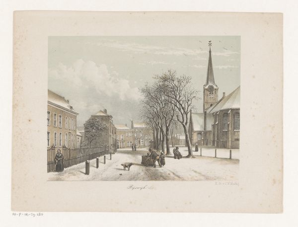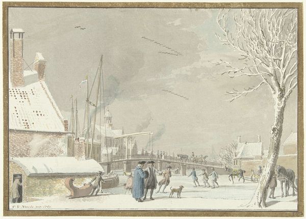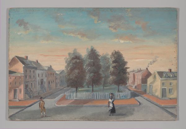 Curator: Well, here we are in front of "City Watchman," created in 1870 by William P. Chappel. It’s currently part of the Metropolitan Museum of Art's collection. This quiet little piece renders a cityscape scene with watercolor on, I believe, paper or board. Editor: Hmm, I find this painting utterly melancholic. There's a lone figure trudging through what looks like a bleak, snowy landscape. It's like winter's silence captured in shades of grey. Curator: Absolutely, the subdued color palette creates a sense of stillness, maybe even isolation. The symbolism of winter often carries connotations of introspection, hardship, but also resilience, a theme amplified by the figure’s solitary walk. It makes me wonder about the cultural memory embedded in images of watchmen and their duties. In their watchful role, what do they represent to society? Editor: A melancholy, yes. And maybe, there is a sense of impending danger? The way the houses almost loom… They seem to close in on the lonely figure as if trapping him between buildings and a cold sky. There's a narrative lurking, like a forgotten ghost story whispered on a freezing night. Curator: That looming quality brings to mind architectural determinism and it echoes how buildings often represent collective identity and social hierarchies, here made somber by the setting. Plus, look at the lone watchman figure. Dressed so plainly. Is that to show that safety and service come from anyone regardless of social or economic level? And that could serve to show community support, pride, honor or something darker. Editor: Perhaps this artwork reminds me of growing up in an old city, when I would wonder and create wild stories of the people walking down old-town streets after dark, trying to catch the hidden danger, if only in my imagination. A wonderful dream about a world which needs safety, courage, and integrity! Curator: So it’s the personal stories combined with collective memory… It brings you back to that time as a young person. Art's evocative power never fails to astonish me. Editor: Indeed. It reminds me that everyone perceives artwork from different viewpoints. A wonderful trip, indeed!