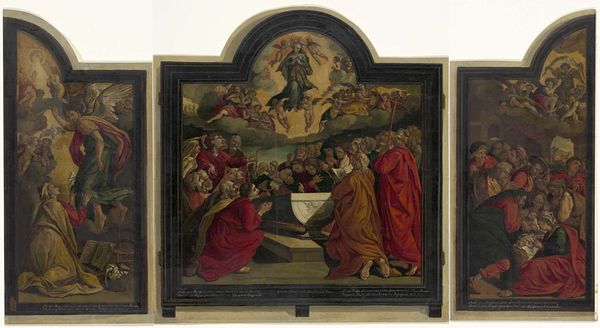 Curator: This artwork, housed here at the Harvard Art Museums, is a triptych. It’s called The Adoration of the Magi, and the two side panels depict The Nativity and The Presentation in the Temple. Editor: It's very striking! The artist’s use of color creates a solemn yet radiant quality. The composition in each panel is densely packed. Curator: Absolutely. An anonymous artist created this. I find myself considering the artist's workshop and the socioeconomic conditions in which these panels were produced. We can see the labor of the craft reflected in the details. Editor: While that's fascinating, I’m particularly drawn to the formal aspects; the interplay of light and shadow in the architectural elements is so compelling. The artist's manipulation of perspective creates depth, drawing the viewer into each scene. Curator: Perhaps the patron dictated certain iconographic elements or the use of specific materials to display their wealth and piety. Editor: I agree that the historical context and material conditions are important. Still, let’s not overlook the inherent artistic qualities and how they shape our experience. Curator: A final thought: considering that we don’t know the artist’s name, it is really humbling to think about the artist's purpose. Editor: It’s a beautiful, multilayered work to contemplate the artistic intention and visual language used to convey the narrative.