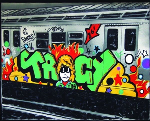 Editor: So, here we have Tracy 168's "Tracy & King2," from 2001, an acrylic piece depicting graffiti art. The colours really pop against the monochromatic background, but I'm curious – what initially grabs your attention about its formal elements? Curator: Immediately, it’s the tension between flatness and depth. Notice how the linear perspective of the train car creates a receding space, but the cartoonish figure and the graffiti, rendered in bold, flat colours, resist this illusion. Editor: Yes, that interplay is striking. The figure seems almost pasted on, disrupting the perspective. How do you interpret that disruption formally? Curator: It forces a reconsideration of space and representation. The graffiti itself, "King2 Tracy", defies traditional perspective. Its layering and jagged edges, create a dynamic surface that contrasts with the rigid lines of the train car. We must ask ourselves what statements about art the artist wishes to make here? Editor: The use of contrasting colours – the vivid pinks and greens against the grey scale – definitely creates a striking visual. Curator: Precisely! This chromatic contrast, amplified by the bold black outlines, enhances the sense of flatness and emphasizes the surface as a constructed plane, rather than an illusionistic window. Editor: It’s almost like the artist is making the point that it’s not trying to reflect reality perfectly, but rather a specific chosen section. Curator: Exactly! He manipulates the formal elements to highlight the artificiality of representation and call our attention to the act of seeing itself, disrupting what we perceive through art and our interpretation of reality. Editor: This piece definitely provides a unique reflection, and by playing around with dimensions and color contrasts, the artist creates new dynamics that go beyond his street style origins. Thank you! Curator: Thank you.