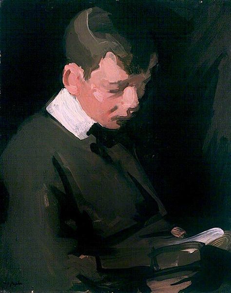Editor: Here we have Samuel Peploe’s “Boy Reading” from 1923, an oil painting that shows a young boy engrossed in a book. The brushstrokes are really visible and give the whole piece this kind of intimate feeling. How do you interpret this work? Curator: The piece resonates with the societal expectations placed upon young men of that era. Look closely at the boy's posture, the formal suit, and the very act of reading. Peploe presents us not just with a portrait, but also a glimpse into the construction of masculinity through education and societal expectations in the early 20th century. What do you think that book symbolizes in relation to the boy? Editor: Perhaps it’s about the pressure to conform and assimilate through knowledge? Or maybe, escapism. Curator: Exactly! The "boy reading" can be interpreted as being a symbol of societal pressure or aspiration, but it also makes you wonder about how this boy sees himself. What narrative does the act of reading create for him? Editor: I see. I guess it’s easy to look at these portraits without considering the deeper societal messages they convey. Curator: And remember the artist’s own context. As a Scottish Colourist, how might Peploe be engaging with or subverting the established traditions of portraiture at the time? Editor: I hadn’t thought of that. It really makes you question the role of artists in reflecting and shaping societal norms and expectations, and what role portraits play. I learned so much more about "Boy Reading."