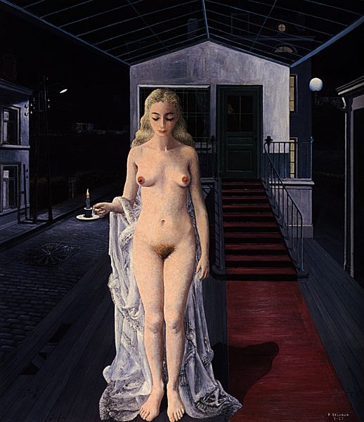 Paul Delvaux painted *Tribute to Jules Verne* with oil on canvas. It's hard to pin down exactly when, but the marks feel so sure, so deliberate. What gets me about this piece is how the figures are illuminated. The paint is thin and luminous, like a veil of light. It reminds me of early Renaissance frescoes, where the artists were trying to capture the ethereal quality of light filtering through stained glass. Look at the way the light glazes over the skin of the figures, almost making them glow from within. There's a contrast between the smooth, almost porcelain-like finish of the figures and the rougher texture of the architectural elements in the background. I'm reminded of the Surrealist project more generally, like a painting by de Chirico, but the specificity of the subjects feels very personal. It's a dreamscape, but one rooted in a very particular sense of nostalgia. Ultimately it remains ambiguous, embracing multiple readings.