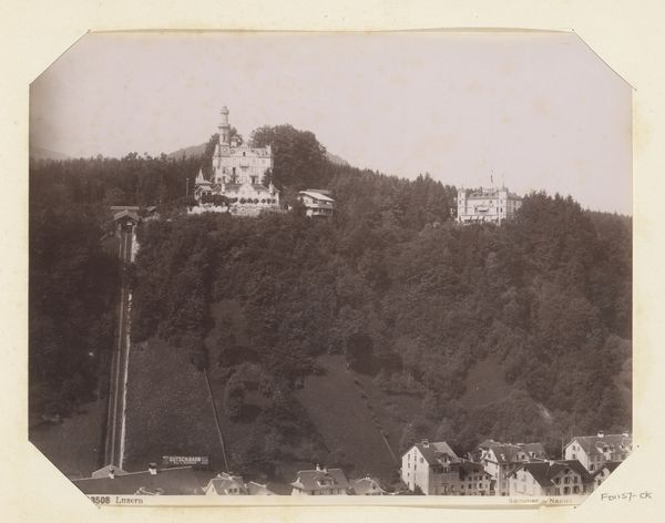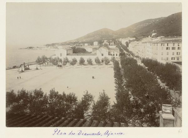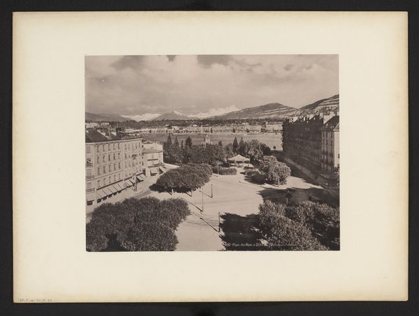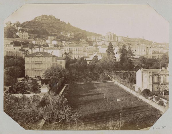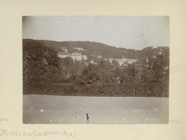 Editor: This gelatin silver print, *Gezicht op Mariënbad* by Hendrik Herman van den Berg, created before 1894, presents a sepia-toned cityscape. There's a feeling of stillness, a kind of hushed reverence in the scene. What cultural echoes do you hear when you look at this photograph? Curator: The prevailing stillness speaks volumes, doesn't it? Think of Marienbad as a resort town, a destination for the wealthy seeking cures and relaxation. Notice the almost performative leisure; even the lone figure walking appears composed. What visual symbols resonate most with you? Editor: Perhaps the curve of the path leading the eye, and the layers of foliage creating depth? It feels staged almost, rather than caught candidly. Curator: Exactly. The Pictorialist movement aimed for photography to be considered fine art, emulating painting. That's why the artist is manipulating the image. Consider also what's omitted. Where's the hustle and bustle you might expect? Instead, we see carefully placed elements encouraging a sense of serenity. Does this resonate with contemporary ideas about leisure? Editor: I suppose we're still striving for an idealised version of 'getting away from it all' - an aesthetic carefully cultivated for display on social media. So perhaps there’s more continuity there than I initially thought! Curator: Precisely! This image presents constructed memory; consider what symbols persist across time, shaping how we view pleasure and wellness even today. Editor: Seeing it that way highlights how images carry coded cultural messaging through the ages. Thank you! Curator: A vital reminder that images often communicate on far more levels than the immediately apparent.