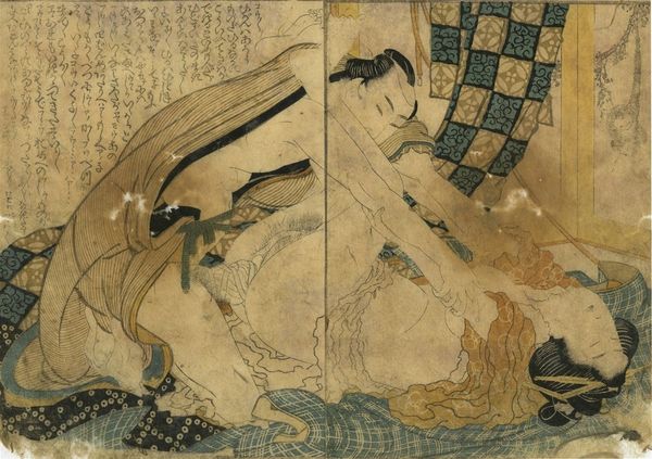 Curator: Utagawa Kuniyoshi's print, "Actor Onoe Kikusaburō," presents a dramatic Kabuki scene. Editor: It’s evocative, almost dreamlike, the stylized clouds give the impression of a stage, and the figure seems lost in thought. Curator: Kuniyoshi, active during the late Edo period, masterfully used woodblock printing to depict popular actors. Examining impressions reveals subtle variations in color application, indicating a multi-stage, collaborative production process involving carvers, printers, and publishers. Editor: Absolutely, you can almost feel the actor's presence, the weight of the costume, the emotion radiating from the precise lines and the flow of fabric. It feels incredibly intimate, as if you're sharing a private moment. Curator: The material culture surrounding Kabuki performances significantly influenced artistic production and audience reception. Editor: Yes, it's a moment suspended, and perhaps a commentary on the fleeting nature of performance. Curator: So, a work of art reflecting not just the actor, but also the industry supporting him. Editor: Leaving us with the beauty and fragility of a single, printed moment.
