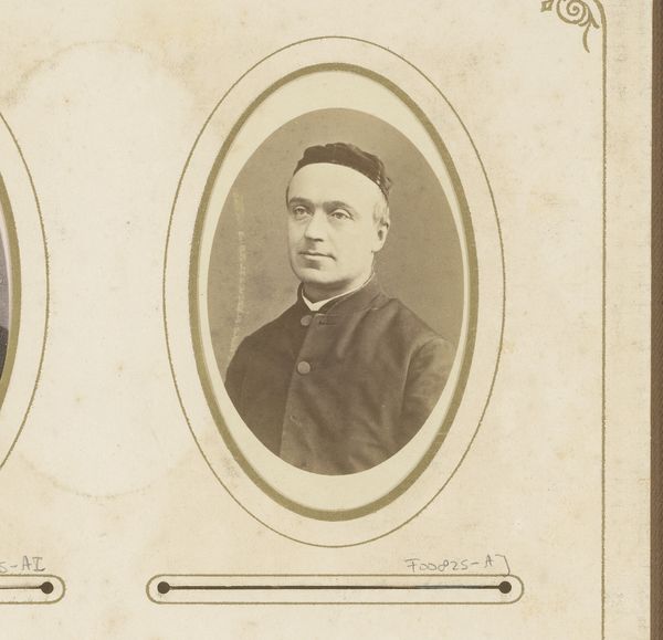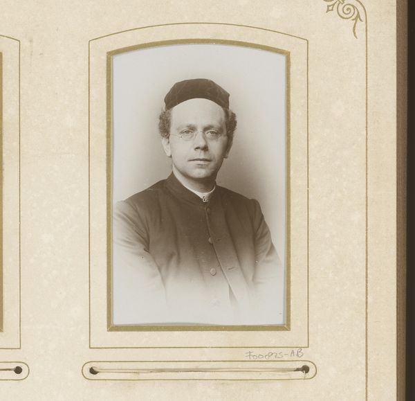 Here is the "Portret van een geestelijke" photo made by Albert A. Kleintjes. The sepia tones and the smooth, almost velvety texture give this portrait an antique feel. The composition is simple, a central oval framing the subject, which creates an intimate and focused experience. The choice of an oval frame, rather than a rectangle, softens the image, suggesting a world that isn't rigidly defined. The subject’s formal attire and reserved expression speak to established social codes and the weight of representation. We can see this portrait as a semiotic system, where clothing and pose act as signs which signify status and identity. Despite its adherence to convention, the portrait subtly destabilizes fixed meanings. The even lighting and soft focus removes any stark contrast, creating a sense of ambiguity and quiet reflection, suggesting the sitter's inner life extends beyond his public role. This portrait invites ongoing interpretation, a dialogue between past and present.