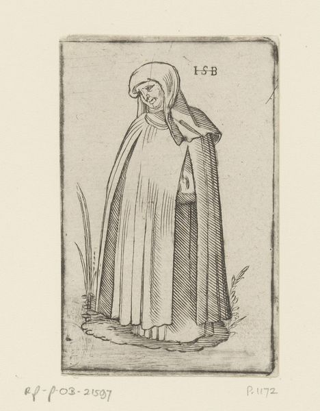 Curator: Take a look at this small print; it's called "Monnik uit Schotland," or "Monk from Scotland," dating from after 1526. We're unsure who created it. What does it conjure up for you? Editor: Bleak landscapes and quiet contemplation! It’s striking, how this figure, enveloped in vertical lines, nearly disappears into the earth beneath and the meager flora surrounding him. He looks as forlorn as the scenery! Curator: Indeed. The stark engraving on paper uses ink to create a Northern Renaissance portrait that seems to carry a heavy, almost melancholic air, wouldn't you agree? Note how the anonymous engraver uses line—mostly vertical—to suggest form and shadow. Editor: Yes, the consistent verticality really emphasizes the figure's downward gaze. There's a strange, almost claustrophobic quality about it. He's framed—hemmed in, even—by those lines, giving a sense of inescapable solitude. The “ISB” inscribed adds a layer of mystification as well, maybe the only trace left by the real author. Curator: Perhaps. The composition directs the viewer's focus towards the subject's facial expression. Though minimally rendered, you still get a sense of world-weariness, don’t you? Editor: Absolutely. The lines etching the old monk’s visage hint at a narrative rich with history, piety, and a palpable connection with a seemingly indifferent nature. Curator: What I find especially fascinating about this piece is how such an unidentified artisan has so masterfully evoked feelings of introspection using a modest level of materials. The Northern Renaissance's influence certainly brought forth a level of art with an impressive spiritual resonance. Editor: True! It goes to show, the enduring impact that formal elements and stylistic qualities combined with evocative themes such as humility and seclusion are truly universal. I wonder who he was... this mysterious monk, caught in the ink of time.