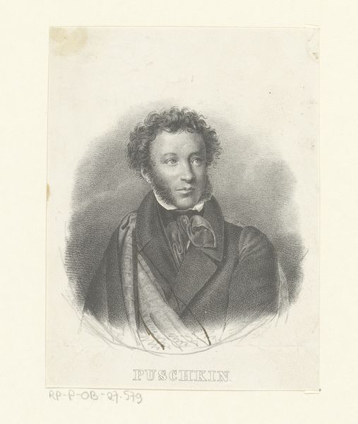 Curator: Here we have a graphite and pencil drawing from between 1822 and 1845; a portrait of Alexander Sergejewitsch Puschkin, attributed to an anonymous artist. It's currently held in the collection of the Rijksmuseum. Editor: It's striking, isn’t it? There's a real immediacy to the line work that suggests a direct engagement with the sitter. I'm interested in the type of paper used, its texture feels almost woven. Curator: Indeed. This was created during the Romantic period. Puschkin, himself, embodied a Romantic ideal. Let’s think about the implications of representing a literary figure in this way. The drawing acts as a form of cultural capital. Puschkin's words, of course, challenged existing structures of power, particularly serfdom and political oppression. His image here also serves as an ideological touchstone, both affirming and solidifying his place in Russian intellectual history. Editor: Considering the timeframe, the access to high-quality paper and graphite would have been limited to certain social strata, reinforcing a social structure within the material itself. The very act of creating this image, of consuming such refined material, signifies privilege and suggests the drawing served the purpose of honoring Pushkin within a specific, probably elite, circle. Was it commissioned? Assembled for mass production later in print form, which looks likely? How were these choices made in that context? Curator: Good questions. And consider, the artist’s anonymity in this case could suggest that the politics surrounding Puschkin’s image were already complicated. Identifying the hand, as it were, might have carried implications for both artist and sitter. In representing Pushkin in this form, were they aligned in any sociopolitical agenda? This brings up important dialogues on the politics of artistic labor. Editor: Precisely. Let's not ignore the labour of paper making in that period either. I find myself pulled back to thinking about the graphite too; the source, refinement, trade networks, and the journey to become a tool wielded to capture an image. These processes echo throughout the drawing, and the act of memorialization, in its particular period. Curator: It’s important to explore how his portrait becomes more than just a representation; it transforms into an assertion of identity within shifting political and social sands. Editor: Ultimately, through this drawing, we're looking at how representation can be formed by, and formative of, socioeconomic and historical processes. It invites you to view all those tensions simultaneously.