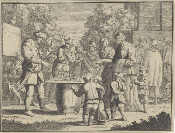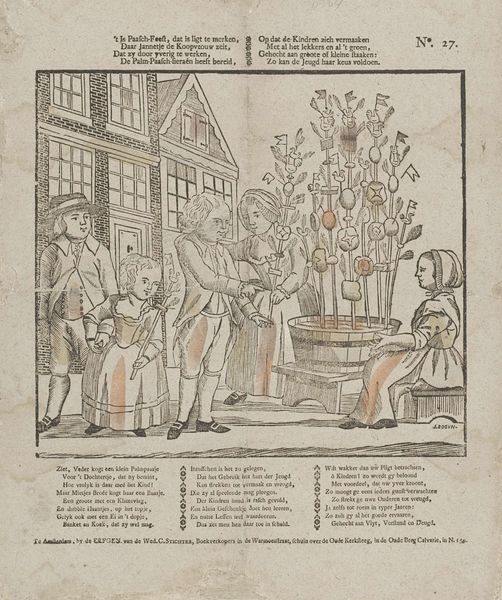 This print, made in Amsterdam, probably in the 1700s, shows children celebrating Paasch-feest, or Easter. But rather than focus on the religious aspects of Easter, it's more interested in how the holiday is commercialized and consumed. The image creates meaning through its depiction of social customs and commercial exchange. We see children admiring and reaching for the ‘Palm-Paasch,’ a decorated tree with sweets and treats, prepared by Jannetje the shopkeeper. The verses beneath the image talk about buying a small palm for a daughter, and the joy a child feels when given treats. This commercialization of religious holidays reflects Amsterdam's culture as a center of trade and commerce, where even religious festivals became opportunities for economic activity. The print seems to promote these kinds of exchanges. To fully understand this print, a social historian would research the history of Easter celebrations in Amsterdam and the role of merchants in shaping cultural traditions. We can consider the meaning of art as contingent on social and institutional contexts.