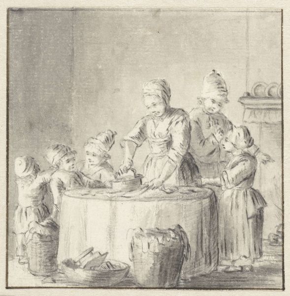 Curator: Jacques Dassonville created this piece, "Peasant woman, seated, and cooking, with three children and a man around her" sometime between 1635 and 1675. It is a print, specifically an engraving, now residing here at the Metropolitan Museum of Art. Editor: Immediately, what strikes me is the depiction of labor—the repetitive action of cooking enacted by the mother, the simple, almost rudimentary implements, and the clear visibility of daily life's constraints. Curator: This aligns with the Dutch Golden Age genre painting style. The image seems to be saying something about the social dynamics of 17th-century peasant life, highlighting family structures and maybe gender roles, don't you think? Editor: Yes, the image provides a lens onto those dynamics. What I find really compelling is how the production process—the creation of food from basic ingredients—mirrors the artist's own process of creating an image using simple tools and materials. Curator: Do you mean to highlight the potential of elevating a simple scene, rooted in hard work, and making it visible and therefore valuable? Because what is considered valuable and what labor is celebrated is historically skewed based on class, gender, and other aspects of social standing. Editor: Exactly. This is no idyllic landscape, nor a royal portrait. It's about making the invisible visible. You see the labor etched into every line of this print, every scratch in the metal. It reminds you of the material effort that went into its creation, the labor behind art itself. Curator: Considering that context makes me think about how access to resources and visibility differed immensely for women and those from lower economic statuses, making art depicting them an unusual act. But also perhaps the print would serve different function within such a group. Editor: Possibly. Engravings like these often served practical purposes. But here it serves as documentation of labor. The very process of creation seems to echo and honor that labor, suggesting its importance, or at least its pervasiveness, in this particular society. Curator: It's interesting to view it from this material perspective and understand how the actual artistic methods used connect so deeply to the subject portrayed. Editor: Yes. Looking closer makes one see the reflection of social effort not only in the portrayed family but the work it must have taken to portray them.