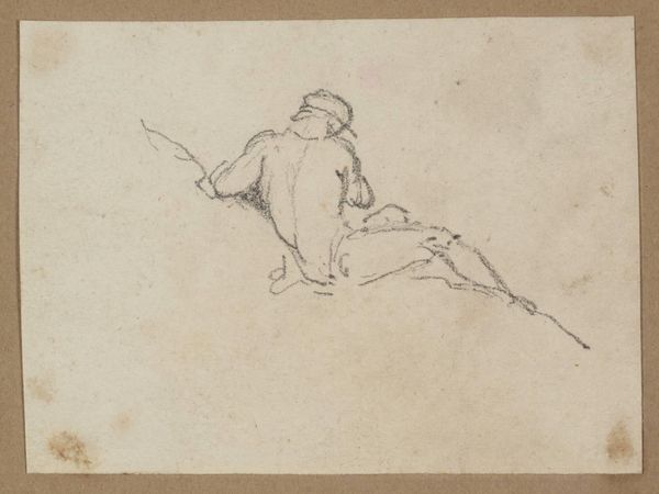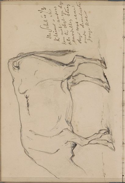 Curator: Today we're looking at "Liggende koe met een bel om de nek," or "Lying Cow with a Bell around its Neck," a pencil drawing on paper attributed to Johannes Tavenraat, likely created between 1858 and 1859. Editor: My initial impression is one of simplicity. It’s remarkably spare, just a few lines capturing the essence of this reclining animal. The light touch creates a feeling of tranquility. Curator: Tavenraat was working in a period of agrarian shift. The seemingly bucolic scene holds a subtext when considered through the lens of rapid industrialization and its effect on farming communities. It might represent a nostalgic longing for a disappearing way of life, or perhaps an idealization of rural existence. Editor: From a formal standpoint, I am struck by how effectively Tavenraat uses line weight to define form. Observe the varied pressure of the pencil – heavier strokes suggesting depth and shadow, while lighter, sketchier lines convey the texture of the cow’s coat. It is more about conveying the idea of volume through tone and contour. Curator: The bell around the cow's neck, small as it is, speaks volumes, too. Historically, these bells signified ownership and control. We must think critically about how ownership dynamics can be read. It underscores humanity's relationship with the animal, moving from mutual co-existence to resource and property, reflective of power structures of the time. Editor: I find the economy of means captivating. This isn’t just a depiction of a cow, but an investigation into the fundamental elements of visual representation. Curator: By considering Tavenraat's social context, and the shifting world surrounding him, this seemingly straightforward sketch invites an interesting exploration of societal tensions between rural life and modernity. Editor: Ultimately, this sketch teaches about how simplicity of form can hold extraordinary complexity of design, leaving an impact.