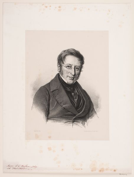 Curator: This is Pierre Roch Vigneron’s “Portret van Jacques-Antoine Manuel,” created in 1823. It seems to be a print, possibly from a drawing or etching. Editor: My first impression is one of stoicism. The subject has a very serious, almost severe look, softened only slightly by the light shading around his eyes. Curator: Jacques-Antoine Manuel was a prominent figure in post-Revolutionary France, a lawyer and politician known for his liberal views. He was a defender of individual liberties and a critic of the Bourbon Restoration. He even lost his seat in the Chamber of Deputies for challenging the King! Editor: The attire clearly places him within the early 19th century. The high collar, the carefully knotted necktie. There’s an intentional air of formality and respectability being conveyed here. The symbols suggest power and authority but it does not escape a feeling of an individual ready to take a position of defense. Curator: And that context is crucial. In portraying Manuel, Vigneron isn’t simply creating a likeness. He’s immortalizing a champion of liberal thought during a period of intense political repression, challenging the legitimisation of the crown’s power. This image could be interpreted as a call to action. Editor: There’s also the question of the gaze. He's looking slightly off to the side, as if contemplating a weighty issue. It avoids a direct challenge but definitely demands reflection on the viewer. His expression is almost paternal, suggesting not defiance but wisdom. Curator: I agree. The averted gaze is significant. Direct eye contact might have been read as overly confrontational, dangerous even. Vigneron seems to navigate those tricky politics very carefully. Considering that the work has been cataloged as pencil drawn could explain the overall lightness of the artwork and the decision to make Manuel have a more mellow expression. Editor: Seeing it now in this broader context enriches it. This portrait then transcends mere physical likeness; it becomes a powerful visual statement imbued with meaning for generations struggling for political and social change. Curator: Absolutely. The artwork also gives room for different interpretations depending on who is seeing the figure. This dialogue of interpretations is essential when observing the portraits. Editor: Exactly. And thinking about these visual cues really allows one to revisit historical context.