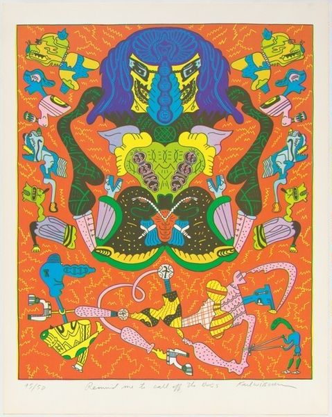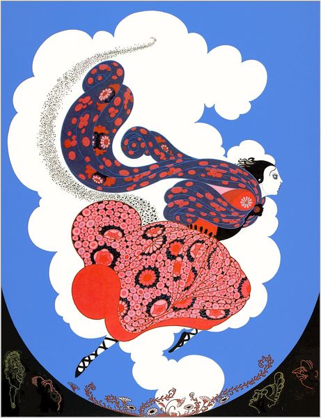 Curator: Welcome. Here we see "The Seven Deadly Sins, Gluttony" by the artist Erte, rendered in a vibrant mixed-media graphic style reminiscent of art deco aesthetics. What are your initial thoughts? Editor: A decadent dream! It’s that kind of over-the-top fantasy that only someone obsessed with pure indulgence could conjure. I’m almost tasting that pineapple. Curator: It certainly plays with the symbolism of appetite. We see culinary elements dominating the composition: knives, forks, spoons— a whole arsenal— poised like a bizarre sunburst over a reclining figure. Editor: That figure is disturbing and intriguing at the same time. He’s reclining with the luxurious indolence, but what's going on with that opening in his stomach showing various food items? Curator: Yes, that's precisely the point. It's a potent visual metaphor for the sin of gluttony itself. He's consumed so much that his interior is bursting forth for all to see. Notice how the "architecture" around the figure is framing an excessive behavior—this speaks to Erte’s commentary on spectacle and the role imagery plays in endorsing or critiquing certain social practices. Editor: I’m thinking the same; It's as if the artwork wants to highlight how empty all of the pleasures can make someone feel. That void in his middle looks painful, and isolating. The dishes float above, detached—like unattainable cravings, forever out of reach despite the surface indulgence. Curator: Exactly. There’s a theatrical element, too, drawing from Erte’s background in stage design. The composition feels carefully constructed, inviting us to reflect on themes of excess, desire, and societal judgments surrounding them. Editor: Yes. In my mind, "Gluttony" seems less a condemnation and more of a fantastical cautionary tale—delivered with just enough flamboyant charm to be slightly addictive. Like a sugar-coated poison pill, I imagine. Curator: Precisely. It is an evocative blend of artistic allure and somber commentary. It highlights how artworks serve as social mirrors, reflecting—and challenging—the prevailing values and attitudes towards human behaviors within particular times and places. Editor: And perhaps it makes one question their relationship to, say, dessert!