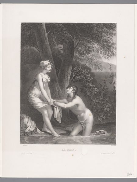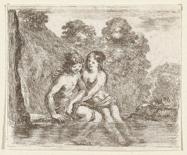 Gerard de Lairesse created this print, "Adam and Eve in Paradise," using etching. The composition is immediately striking, featuring a dense, almost claustrophobic arrangement of figures and foliage in the foreground, which gives way to a more open landscape in the background. Observe the stark contrast in textures, from the smooth, idealized forms of Adam and Eve to the intricate, almost chaotic details of the surrounding nature. This contrast serves to highlight the tension between the human and natural worlds, a theme resonant with the period's philosophical inquiries into humanity’s place in the cosmos. The figures themselves are rendered with a classical sensibility, their poses reminiscent of ancient sculpture. Yet, they are placed within a landscape that is far from idealized, a kind of visual dissonance that destabilizes any easy reading of the scene. The artist invites us to consider how the visual elements of the artwork engage with broader cultural and philosophical discourses around innocence, knowledge, and the Fall.