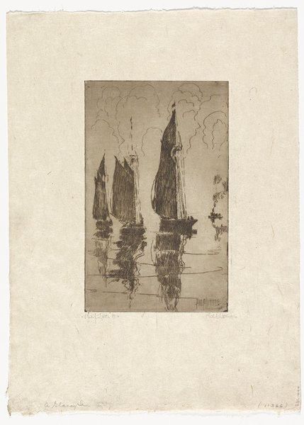 Editor: This is "Farandoleuses" by Ludovic Alleaume, painted around 1900. It's an oil painting that feels incredibly dreamlike. I'm struck by how the artist uses light and shadow to create such an ethereal atmosphere. What do you see in this piece? Curator: Initially, I am drawn to the painting's formal composition. The artist has created a scene where the verticality of the solitary tree acts as a visual anchor, contrasting against the circular motion suggested by the figures. Note how Alleaume employs a limited palette; this reduction creates a harmonic relationship between the various elements and contributes to the image's overall sense of unity. Editor: It's interesting how the tree and the dancers work together compositionally. Is that tree a visual device or do you think it means something symbolically? Curator: Symbolism certainly could play a part, but viewing it from a formalist perspective, one recognizes the way its towering presence effectively counterbalances the horizontal spread of the landscape and emphasizes the limited depth of the pictorial space. How do you read the relationship between the dancers and their surroundings? Editor: They seem like they’re dissolving into the landscape almost. It’s not clear where they begin and the environment ends. Curator: Precisely. This ambiguity reinforces the flatness of the picture plane, which becomes especially prominent in this Impressionist mode. The painting operates successfully then, on its ability to orchestrate this balance, engaging the viewer through both spatial illusion and its deliberate denial. Editor: That's fascinating. I had been so focused on the atmosphere that I overlooked some of the more formal qualities that you’re describing. Curator: Yes. By analyzing the interplay of form, color, and composition, we arrive at a deeper understanding of its aesthetic impact, separate from symbolic or narrative interpretation. Editor: This has given me a new appreciation for the painting. Focusing on the formal elements has revealed a structural complexity I hadn’t noticed initially. Curator: Indeed. A keen eye and careful observations invariably allows us new entry points for comprehending artwork, unveiling fresh perspectives.