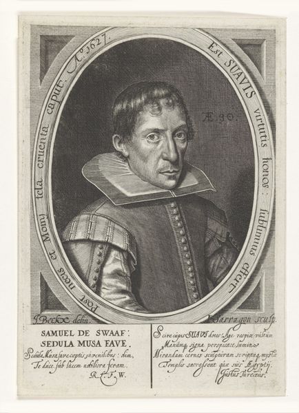 Curator: Pieter de Jode I's engraving, "Portret van Willem Teelinck," dating from sometime between 1590 and 1632. We can see it here at the Rijksmuseum. Editor: My immediate response is the sheer amount of symbolic framing. The lettering almost seems to trap the portrait, contributing to a formal and even somber atmosphere. Curator: I see that too. Consider the historical context: portrait engravings such as this served a crucial function in disseminating images of influential figures. Willem Teelinck was a prominent minister. This print allowed his likeness and therefore his ideology to spread among a wide audience at a pivotal time. Editor: And it is full of coded symbolism! The book he holds speaks not just of learning but likely references holy scriptures. The way he's holding it, slightly away from his body with the fingers, implies perhaps a certain guarded approach or dedication. Look also at the lettering inscribed within the ornate oval frame, how each carefully placed word evokes an air of sacred authority. The overall image constructs an undeniable statement of power, using symbolism to shape perception and emphasize certain virtues. Curator: But let’s not overstate. It’s worth acknowledging that the very act of commissioning such a portrait—likely by Teelinck himself—speaks to a careful crafting of public image. While symbols certainly play a role, they function within a context of self-representation, influenced by the prevailing social and religious norms. Was he conforming to or challenging perceptions? Editor: I find it compelling to consider how different audiences throughout time would have interpreted these images. Was it viewed as a true likeness, and would they immediately understood that the minister was, or aimed to be, both compassionate and wise? Curator: Ultimately, an image like this serves as an archive of its time, showing us how those in positions of power wished to be seen and remembered, a curated intersection of self-fashioning and wider societal values. Editor: Yes. Each careful stroke invites to delve beneath its layers into the mindsets, ideals, and long-forgotten cultural nuances that define both the man, and the time when he lived.