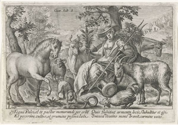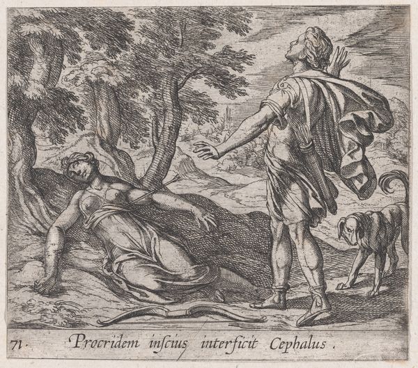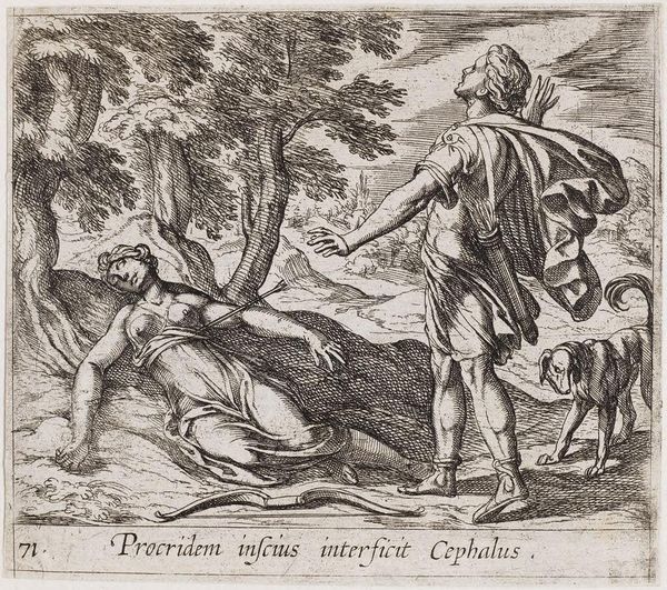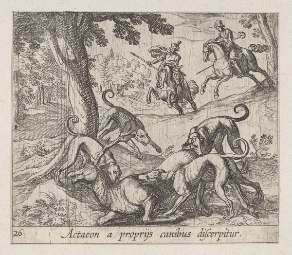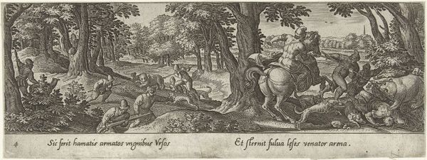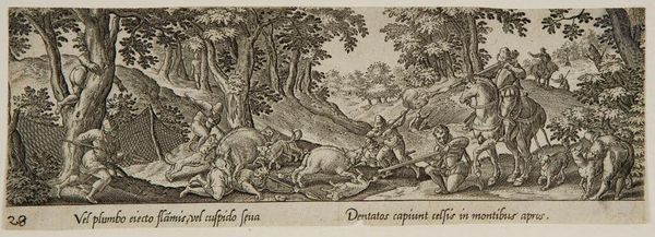 Editor: Here we have Philips Galle's "Stierenjacht," which roughly translates to "Bull Hunt," created sometime between 1582 and 1636. It’s an etching, and what strikes me most is the sheer dynamism of the scene. It’s chaotic, figures are rushing and the landscape is engulfing them, almost obscuring everything but the action. What do you see in this work, looking at it from your perspective? Curator: I am primarily drawn to the formal elements within this composition. Note the interplay between light and shadow created by the artist's skilled use of line. See how that directs our eye across the picture plane, carefully orchestrating our viewing experience? This controlled rhythm, achieved through the formal arrangement, structures the chaos that you noticed. Editor: Yes, now that you mention it, the figures, though many, do seem to follow the direction of the light... almost as if following a winding road? How do you feel this technique reinforces the story being told? Curator: Observe how Galle meticulously rendered the texture of the trees, contrasting it with the relatively smoother treatment of the figures. This disparity reinforces the thematic conflict between nature and man. Consider how such precise control over technique conveys a narrative. Ask yourself: what effect does the stark tonal contrast serve, visually and conceptually? Editor: So, would you say that the subject itself - the hunt - is secondary to the formal choices made by the artist in the print’s visual composition? Curator: Precisely. It is the interplay of line, tone, texture, and compositional structure that provides us with insight into this print, inviting engagement and prompting interpretations based upon our rigorous analysis. Ultimately it transcends its subject, presenting a constructed visual argument. Editor: I see. I was initially focusing on the hunt, but I'm starting to appreciate how much more is communicated through Galle’s handling of the artistic tools themselves. It's a very different way to approach the piece. Curator: Indeed. And it's in recognizing those deliberate choices that the artwork begins to truly resonate, offering more than just a surface-level narrative.