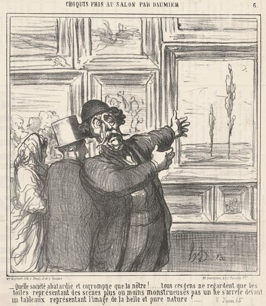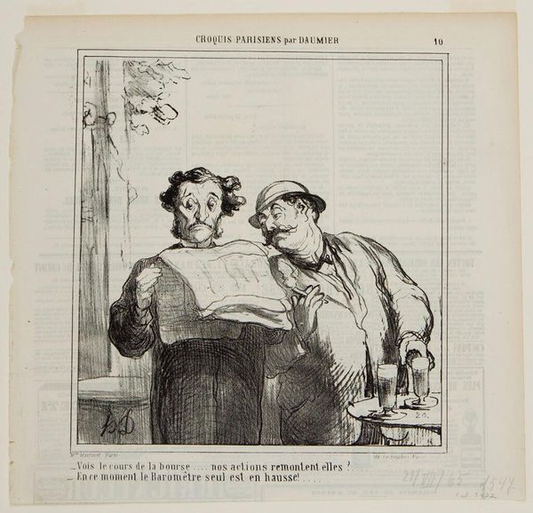 Editor: This is "Vois le cours de la bourse," or "See the Stock Market Report," a lithograph print by Honoré Daumier, from around the 19th century. It features two men intensely reading a newspaper, but their exaggerated features make it almost comical. What do you see in this piece? Curator: The power of caricature lies in amplifying inherent cultural anxieties and class dynamics, which is potent in this piece. The men’s anxious expressions, juxtaposed with the relaxed setting of presumably a cafe with drinks, speaks volumes. How do their faces and bodies reflect their supposed social roles, and the perceived stakes of their financial concerns? Editor: I guess I see some class tension in their clothes and the fact that they seem to be following the stock market so closely. The man in the hat seems calmer, perhaps he has more to gain? Curator: The hat indeed marks social positioning, but observe the newspaper they both clutch – it's the symbolic nexus of their concerns. Do you think the artist used that to critique or simply represent bourgeois anxieties about their aspirations and social standings in the Second Empire? The "barometer," as the text mentions, functions as a metaphor. Editor: It feels like both, really. Daumier is showing us something very real about their lives, but also poking fun at them a bit. The constant search for rising values and social validation... it feels very relevant. Curator: Exactly! Daumier cleverly uses the mundane activity of reading the newspaper to tap into much larger, enduring themes. It makes me wonder, how will contemporary artists interpret our obsessions in years to come? Editor: That's a great question. It makes you think about what symbols from our time would have the same resonance. Curator: This brief look has enriched my view by emphasizing that symbols of daily life can embody the most significant societal obsessions. Editor: Absolutely, seeing that interplay between the immediate and the grand has definitely deepened my understanding.