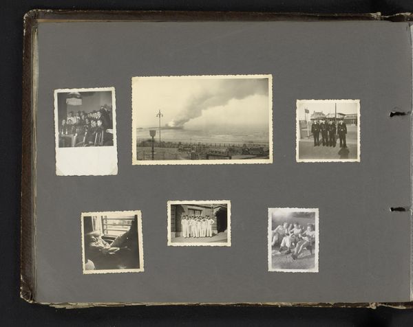 Curator: Look at this fascinating photographic collection, simply titled “Landjahrlager 1935 in Wolmersdorf,” dating back to between 1935 and 1938, rendered as an albumen print. Editor: Woah, a wave of organized dread washes over me. I see conformity staring back. Is it the stark uniformity of the buildings or that looming flag in one of the images? The cloud composition seems to scream. Curator: The images document a “Landjahr” camp, rural education camps implemented during the Nazi era, to indoctrinate youths. That starkness echoes the regime’s austere aesthetics but also its ambition to control. You immediately pick up on the sense of institutional control, and yes, that flag… It serves as a strong visual. Editor: Right. I can't help but notice the contrast – almost like visual propaganda versus the banality of everyday life, even in indoctrination. One shot has those cold barracks; in another, they are trying to have it appear almost domestic. Curator: You've got it exactly! Consider that photographic albums, in their creation and arrangement, were deeply personal records, like contemporary blogs or scrapbooks. So it begs the question what prompted the album’s creator to preserve, possibly celebrate, but potentially also document this experience of political propaganda. And the German Expressionism lends itself perfectly to this interplay between what is captured and what is revealed through it. Editor: I imagine holding that old album and feeling so conflicted. Photography can hold many meanings. We are observers of these places as distant viewers. The shadows and sharp angles amplify that eerie tension and those tight beds, like cells of the spirit, chilling stuff. It gets me how it's been assembled in a regular pattern; there’s almost something too tidy about it that reflects on what the Nazis valued: discipline and rigidity. Curator: It highlights how photography itself became an ideological tool in the era of social upheaval, while those seemingly neutral documentary images carry deep political weight. They offer a poignant window into that period that encourages a profound moment of reflection. Editor: Indeed. An uncomfortable beauty reflecting a haunting past—a paradox worth remembering and examining in ourselves too.