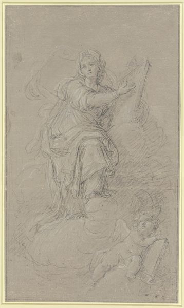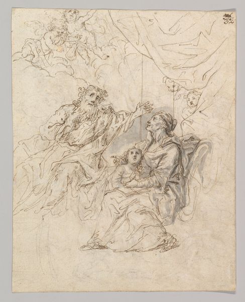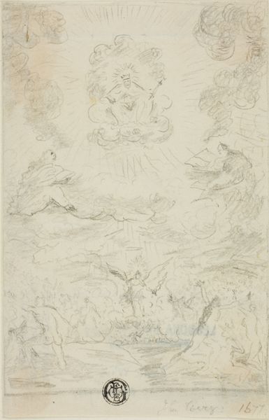 Antoine Rivalz rendered this drawing, Adoration of the Virgin, using graphite on paper. Here, we see the Virgin Mary, hands clasped in prayer, surrounded by angels amidst swirling clouds, evoking a sense of divine ascent. The motif of a central figure surrounded by adoring figures has ancient roots, appearing in various cultures, from depictions of emperors with their retinues to religious icons. The Virgin's upward gaze and the angels' reverent gestures create an emotionally charged atmosphere. Consider, for instance, how the raised hands of the Virgin echoes the "orant" pose found in early Christian art, symbolizing supplication and divine communication. It's a gesture that transcends its immediate religious context, tapping into a primal human expression of hope and yearning. The non-linear progression of symbols and their evolution across time is palpable, as if this image is not merely a depiction but a vessel carrying the weight of collective memory.