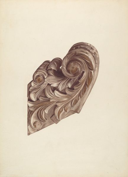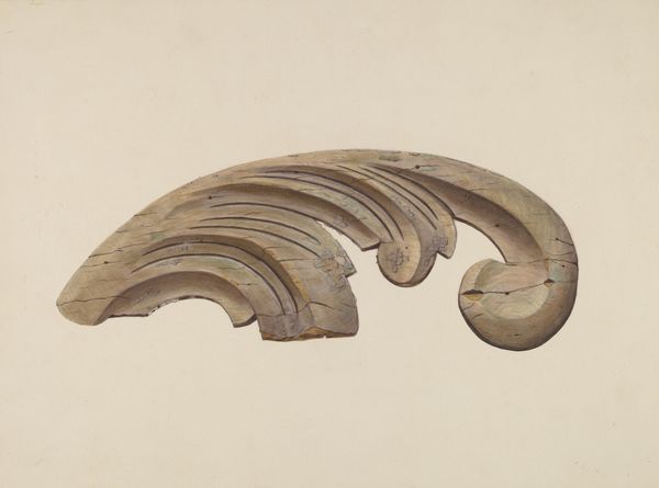 Hazel Hyde made this watercolor and graphite drawing of a billethead from the ship "Favorite" at an unknown date. Look closely and you'll see how the medium and technique influence the artwork's appearance. The drawing captures the textural qualities of wood and the marks of carving tools, giving a sense of the original object's weight and form. The process involved in creating the original billethead, likely by a skilled ship carver, reflects a long tradition of craftsmanship. The billethead served both functional and decorative purposes, and its creation would have been a labor-intensive task. The drawing, in turn, transforms this labor into an aesthetic experience, inviting us to consider the social context of shipbuilding. It also challenges traditional distinctions between fine art and craft. Here, the act of representing the billethead elevates it to a subject worthy of artistic attention.