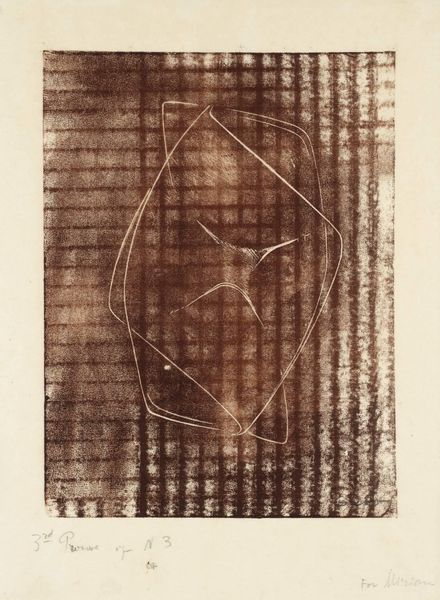 Curator: Looking at this untitled print by Naum Gabo, from the Tate collection, I'm struck by its quiet strength. It's only 160 by 139 millimeters, yet it feels monumental. Editor: There's a vulnerability to its ethereal quality, and I find that quite disarming. The stark lines against that textured ground conjure a sense of longing or searching. Curator: Gabo's use of printmaking here, devoid of a specific date, emphasizes the industrial process. It's reproducible art, speaking to a broader accessibility of aesthetic experience beyond the elite. Editor: I see it reflecting on the precarious position of the individual within increasingly abstract systems. Is there a critique of power structures here, or an acceptance of inevitable changes? Curator: Perhaps both. By embracing industrial techniques, Gabo acknowledges evolving modes of production and consumption—it is a celebration and a question. Editor: Ultimately, this small work invites us to contemplate our place in a rapidly changing world, prompting questions about identity and the search for meaning.