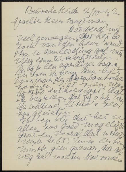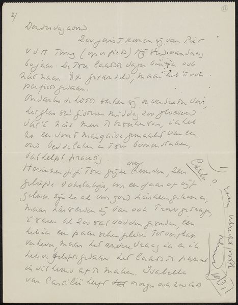 This letter to Jonkheer Hendrik Teding van Berkhout was written in 1933 by Jo van Oosten Slingeland. The quick, looping marks made with the pen give the impression of someone dashing off a message, a train of thought captured mid-flow. I love how the ink varies in tone; it shows the pressure of the artist's hand, the changing speed and rhythm of the writing. See how some of the letters are thick and bold, while others are thin and wispy? It’s a bit like a landscape, with peaks and valleys. The slight bleed of the ink into the paper adds a tactile quality. You can almost feel the texture of the page. The whole thing has a casual, intimate feel, like a peek into someone's private correspondence. The red marks feel like an addition, maybe someone else responding or adding information later on, an added layer of time and interpretation. It reminds me a little of Cy Twombly's scrawled surfaces, a kind of controlled chaos where language becomes image. It's a reminder that art, like conversation, is an ongoing process, full of revisions, tangents, and second thoughts.