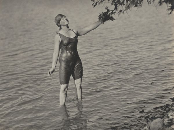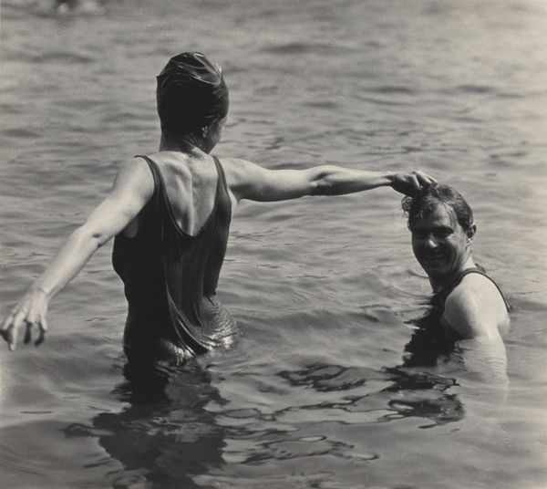 Editor: This is Alfred Stieglitz's photograph, "Kitty Stieglitz and Edward Stieglitz," from around 1918. It has a relaxed, almost carefree feeling, despite being a black and white photograph. What do you make of this, as a portrait of this time? Curator: The photograph strikes me as an interesting negotiation of identities within early 20th century America. Here we have what appears to be a portrait of leisure, capturing a moment of domesticity. Yet, consider the context. The rise of modernism challenged traditional social structures and expectations, particularly concerning gender and familial roles. The sitters are posed in an aquatic, primordial landscape. Editor: So, are you saying this image breaks away from traditional portraiture, to hint at the emerging societal norms of the time? Curator: Exactly! Stieglitz’s work often challenged conventional ideas. Think about what it meant for Kitty, possibly his relative or close acquaintance, to be depicted in swimwear, actively participating in outdoor recreation. Was she only included as someone to manage and keep track of, rather than on her own accord? The era saw shifting perspectives on women's roles and expressions of freedom. Is it a revolutionary statement? Not overtly. Yet it normalizes female agency and self-representation in ways earlier portraits often did not. Consider the gaze. What does Kitty’s almost assertive look toward the camera suggest to you? Editor: That she isn’t merely an object? That there’s self-determination present? I guess I hadn't considered all of that. Thanks for highlighting the social narrative! Curator: Indeed. It encourages us to consider art’s power not just to depict, but to subtly shape and reflect cultural change. We've begun to excavate the many meanings present in one picture, of the period and people. Editor: I'll definitely look at art differently now. Appreciating both subject and subtext feels crucial to gaining the most meaning from art.