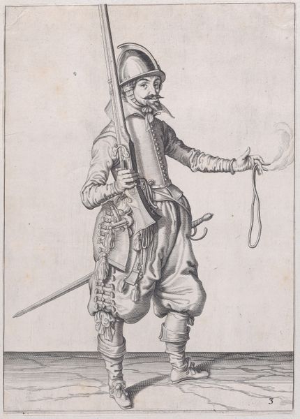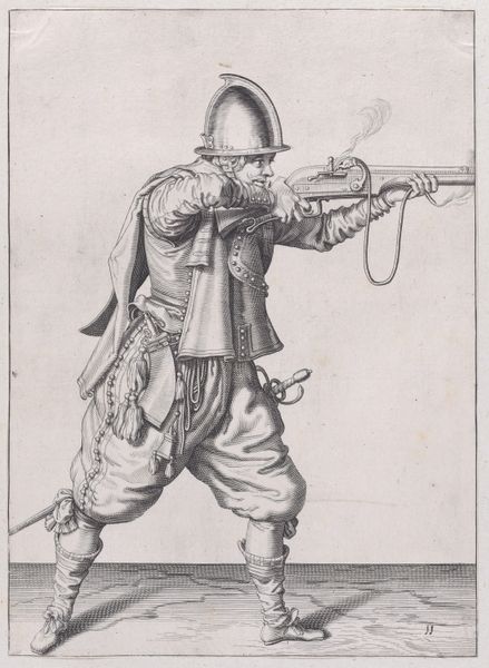 Jacques de Gheyn II created this print, A Soldier Pouring Powder into the Pan, as part of his “Exercise of Arms” series. The composition centers on the figure of a soldier, meticulously depicted with fine, precise lines. Note how Gheyn uses hatching and cross-hatching to create depth and texture, especially in the soldier's clothing and the complex mechanism of his musket. The neutral background emphasizes the stark reality of military preparation, devoid of any romanticism. The series functions almost like a manual, breaking down the complex actions of loading and firing a musket into a sequence of distinct steps. In this sense, we can see a parallel to the scientific and philosophical inquiries of the period, which sought to understand and categorize the world through systematic observation and representation. Gheyn’s work embodies this intersection of art and science, reflecting the era’s emphasis on precision and empirical knowledge. The artist here isn't just capturing an image, but is dissecting a process.