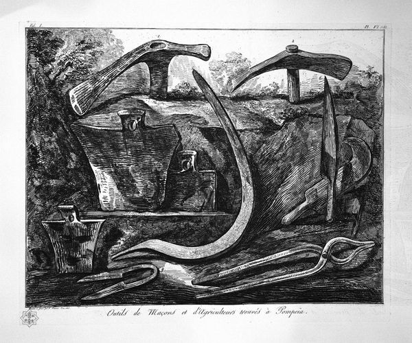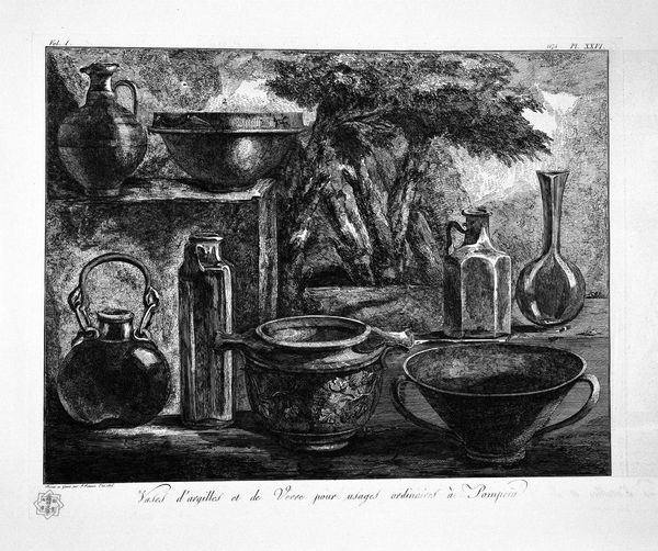Giovanni Battista Piranesi made this etching titled "Jars of clay and glass found in Pompeii." Note the interplay between the rough texture of the pottery and the clear, smooth surfaces of the glass, reflecting light in stark contrast. The composition is divided into two horizontal planes: the upper one containing the backdrop of dense foliage, and the lower one displaying an assemblage of vessels. Piranesi uses a limited tonal range, yet achieves a sense of depth through varied line weights and hatching techniques. This creates a rich interplay of light and shadow. The objects are carefully arranged, each one possessing its unique silhouette, from the simple cylinders to the more ornate jars with handles. These visual elements are part of a larger cultural discourse around archaeology and the fascination with antiquity during the 18th century. Piranesi masterfully communicates not just the physical attributes but also the historical weight of these everyday objects.