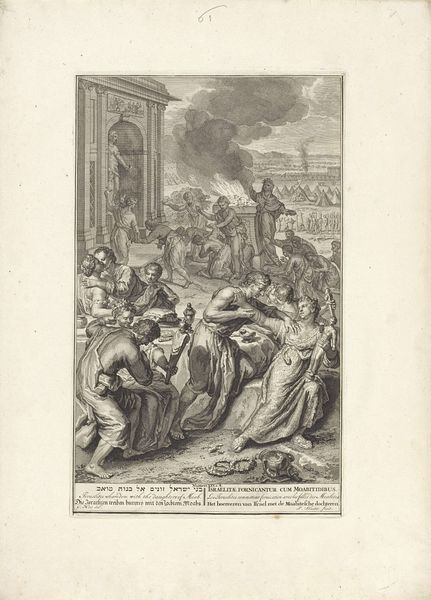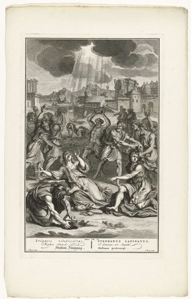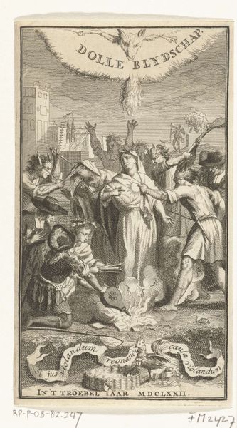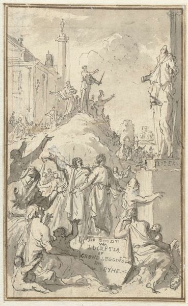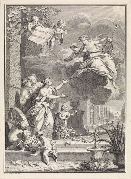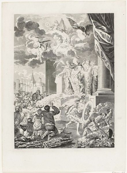 Curator: Here we have an engraving by Jan Caspar Philips, dating back to 1751-1752, titled "Allegorical Representation with Faith, Crowned Woman, and History." It’s a fascinating piece currently held here at the Rijksmuseum. Editor: Whoa, it's like a dream sequence. Everyone’s posing intensely in a very dramatic landscape—even those folks way in the back, by what looks like…a ziggurat? And some ladies floating on clouds are watching the show from above. Very Baroque indeed! Curator: Precisely. The baroque period loved this kind of layered, symbolic staging. We have figures embodying faith with the cross, and history with a quill and open book being recorded by the Angel and other figures emblematic of civic virtues and moral uprightness, everything tied to these figures of Faith and History looking down from above. Editor: Right, so Faith is holding the cross as a literal representation and History is recording facts with her angel companion, but who is that crowned figure between them and what’s up with her goblet? It looks important and yet out of place in what seems to be a setting for martyrdoms and spiritual dedication. Curator: That crowned woman can be seen to symbolize leadership—and how governance ties to moral and faithful history that is witnessed by divine judgement—but I agree, in modern sensibilities this juxtaposition is rather...assertive in its symbolic claim about rule. Editor: "Assertive" is a diplomatic way of putting it. What about that temple thing in the back. I’m curious what a church structure in that shape means with the skyward gaze we just discussed. What memory does that recall? Curator: That form may invoke architectural memory, or at least signal power and stability over long expanses of time; that our lives now are judged against a lineage or heritage that spans both real and imagined events and powers. Note how people literally look toward that monument to indicate its authority over everyday proceedings here in the foreground. Editor: Yeah, even those theatrical clouds feel heavy with the weight of all this symbolism. Still, the attention to detail and how so much cultural memory got distilled into one page of cross hatching—that part I respect. It also kind of reveals how public opinion and visual spectacle blend and mix over time in odd but persistent ways. Curator: A fine point. Seeing echoes of our own era helps animate historical pieces. Editor: Absolutely. Makes me consider how faith and legacy, public opinion and its performance, always seem to be co-stars. Good food for thought, indeed.