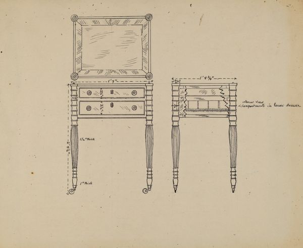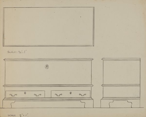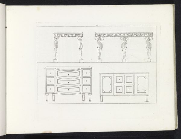 Pietro Ruga created this drawing, titled *Twee kasten en een koker*, with delicate lines on paper. The composition is structured around three distinct furniture designs, each rendered with precision. The linear quality of the drawing emphasizes form, while the careful attention to symmetry and proportion reflects a classical influence. This piece functions as a design document, but also offers insight into the aesthetic values of its time. Note how each piece is presented not just as a functional object but as an arrangement of lines, shapes, and balanced masses. This treatment aligns with the formalist notion that art's primary value lies in its visual structure. The arrangement of lines and shapes creates a sense of order and balance, yet it also invites us to consider the deeper cultural codes embedded in these designs. Are they signs of status, taste, or societal aspiration?