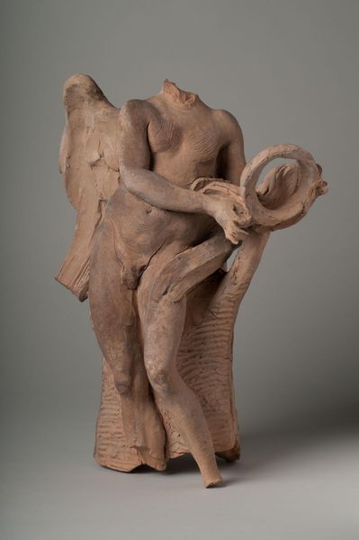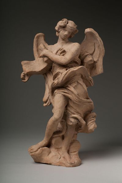 Curator: This terracotta sculpture at the Harvard Art Museums is titled "Angel with the Superscription" and was created by Gian Lorenzo Bernini. What's your initial take? Editor: There's a raw, immediate sense of grief. The angel's posture—arms crossed, head bowed—suggests a profound sorrow. Curator: The superscription refers to the inscription on the cross. Bernini rendered several angels for the Ponte Sant'Angelo, commissioned by Pope Clement IX. This is thought to be a study for one of those. Editor: So, this figure embodies both religious iconography and political power, reflecting the Church's influence? It's interesting how Bernini captures ephemeral emotion in a solid form. Curator: The immediacy you noticed speaks to Bernini's baroque genius. He knew how to capture fleeting moments of human drama and charge them with symbolic weight. Editor: Seeing it as a study helps me understand the energy in the clay. There's a sense of process here—we see the artist working through an idea. Curator: Absolutely, and it reveals how the angel, a symbol of divine intervention, is also deeply embedded in earthly power dynamics. Editor: It is fascinating how a sketch, even one meant to be translated into stone, carries such profound emotional and historical weight.