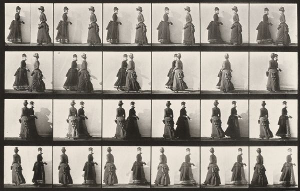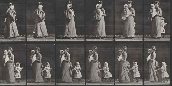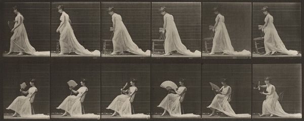 Curator: Well, isn’t this curious! My first impression is of a beautifully antiquated flip-book. So many shades of grey capturing a snippet of motion. Editor: Indeed! What we’re looking at is Plate Number 211 from Eadweard Muybridge’s series "Animal Locomotion," created in 1887. Specifically, it depicts a woman stooping and lifting a handkerchief, a parasol held casually in her other hand. Curator: "Casually" is such a fascinating word to use here, because the whole composition feels anything *but* casual. It’s almost clinical, the way the grid imprisons her movement, dissecting her pose. There's an isolating feeling, almost lonely, as if we’re watching a specimen rather than a person gracefully navigating her day. Editor: And that clinical gaze, that isolating feeling, I think speaks directly to Muybridge’s method. His use of photography broke down complex motion into discrete steps—scientific observation taking precedence. Think about the labor involved; setting up the grids, triggering the series of cameras—the technology itself shapes what is seen, turning a human action into a photographic data set, if you will. Curator: Absolutely. You know, even the gesture of picking up a handkerchief is rendered strangely significant by this fragmentation. Like a still life. It allows one to imagine this woman’s motivations; did she deliberately drop it? Did she catch sight of someone in the distance? So much mystery locked into a momentary and quotidian task. It really challenges that distinction between scientific record and something else, perhaps bordering on theatrical, I'd venture. Editor: Exactly. It speaks to how Victorian society was increasingly mediated by these technologies, both in terms of production but also leisure. Think about the social context; the rise of industry that allowed this kind of mass produced item to be so commonplace. The accessibility to fabrics... she performs, inadvertently, in a still life composed through her garments and social gestures. And it’s all recorded in grayscale. There's no denying, technology shaped even a woman’s simple motions, transforming lived actions into mediated spectacle. Curator: On that note, a fascinating interplay emerges... Thank you, yes. What felt cold before now shimmers a bit more mysteriously for me. Editor: And to me, it serves as a subtle reminder: that our perspectives are shaped through processes that often mask the complexity of everyday materials and motions.