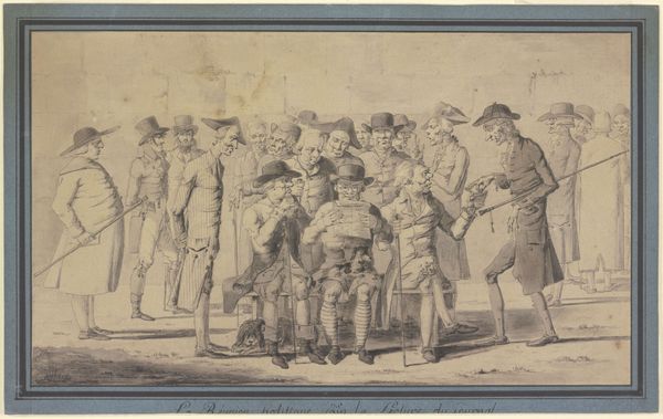 Curator: "One Day's Sport of Three Real Good Ones Numbers will beat Science...The Corinthians bear the brunt," a watercolor, etching, and print by Henry Thomas Alken, circa 1823. Editor: Whew! That's a mouthful of a title, isn’t it? Immediately I get this rowdy pub scene vibe. Looks like the aftermath of a rather intense…hunting trip? Or perhaps a bet gone wild. Curator: The piece really does encapsulate a specific culture and class dynamic, doesn't it? The "Corinthians" of the title refers to wealthy, sporting gentlemen. The etching captures a moment of leisure, rife with social implications. Hunting was, after all, often tied to landed gentry and displays of wealth and privilege. Editor: See, to me, it whispers "masculine anxiety" in a very British accent. The men huddled together, some clearly worse for wear, gives off this almost theatrical air of bravado. It is a beautiful satire! Curator: Satire is definitely at play. Alken often used his art to comment on social behaviors, holding a mirror, albeit a slightly warped one, to the leisure activities of the upper classes. Notice how the artist’s narrative unfolds with details. Editor: Details that scream excess! The sheer volume of dead fowl spilling from the basket – and all those empty bottles! Is that really sport? And the poor soul collapsed in the corner--is he weeping over lost shillings or a bruised ego? It has me thinking about how traditions evolve...or maybe just devolve into chaotic rituals. Curator: I am especially struck by the inscription running along the bottom edge, reading "Numbers will beat Science." Perhaps it suggests a critique of rationality failing to check exuberance? I am convinced it's about how group dynamics overtake better judgment, fueled by a culture of competition and privilege. Editor: Makes you wonder about the lasting echoes of that kind of mindset, doesn’t it? It is like these images tell silent stories, each figure is carrying its weight. Art’s lasting role is often that to make the people ponder the present and past. Curator: Indeed. I’m left reflecting on how these snapshots from the past illuminate continuities in our social fabric and the ever-present interplay of tradition and critique. Editor: And for me, a lingering question: were those "good ones" really having such a good time? Thanks, Alken, for the wonderfully acerbic food for thought.