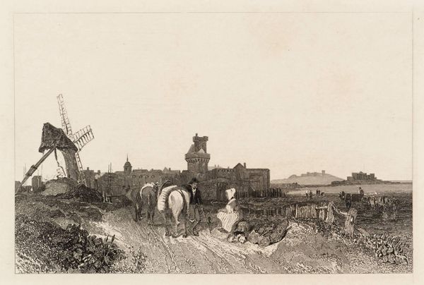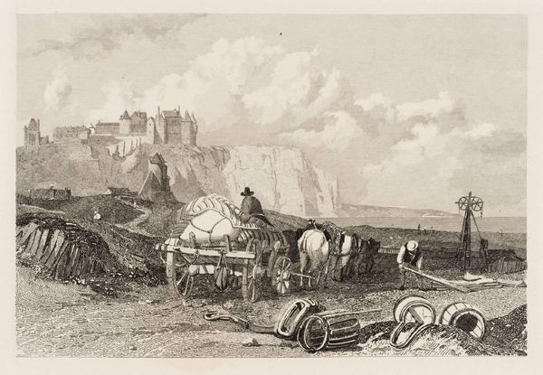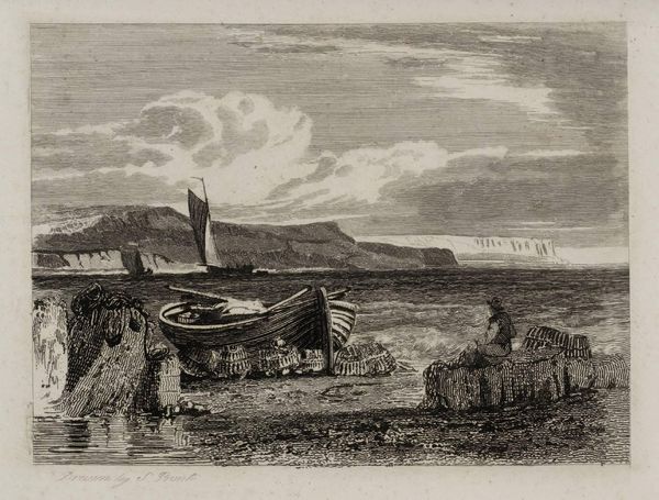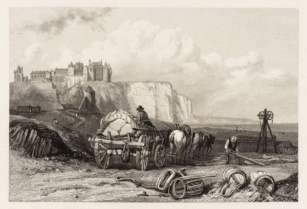 Editor: This is Clarkson Stanfield’s "Dover Pier," engraved by J.W. Appleton. I find the scene quite turbulent. What can you tell me about it? Curator: This print reflects the enormous social and economic shifts of 19th-century Britain, especially the rise of maritime trade and its impact on coastal communities. Consider Dover as a crucial port, not just for commerce, but also for projecting British power. Editor: So, it's not just a pretty picture of the seaside? Curator: Exactly. The pier is a site of labor, immigration, and colonial expansion. How do you read the relationship between the natural landscape and these human activities? Editor: I hadn't thought about it that way. It definitely gives me a new perspective on landscape art. Curator: It's vital to see art as entangled with the political and social forces of its time.