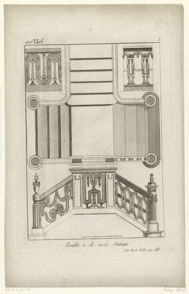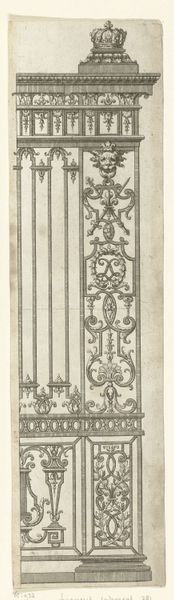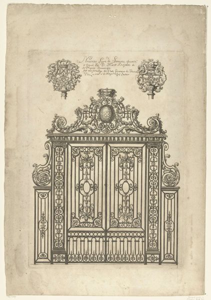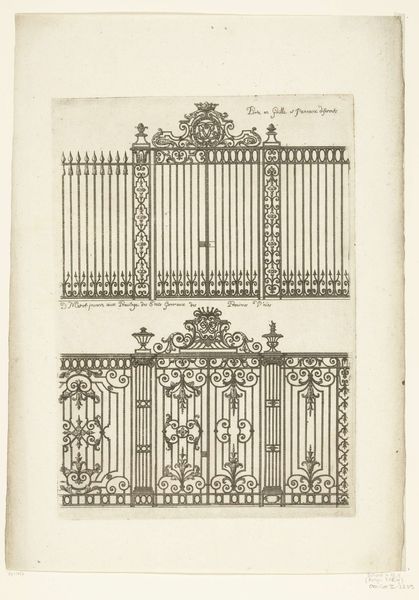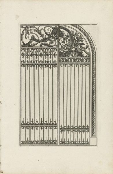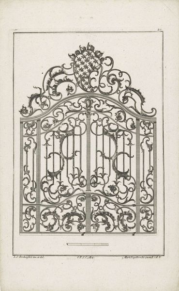 Editor: This is "Titelblad: smeedwerk," which translates to "Title Page: Metalwork," attributed to an anonymous artist, possibly from the mid-18th century. It's an engraving. I’m immediately drawn to the intricate geometric design of the wrought iron. What do you see when you look at it? Curator: Well, I immediately consider the labor involved. Look at the precise linework of the engraving, mimicking the complex techniques of the metalworker. It challenges the distinction between fine art—the print—and craft, the original ironwork. Do you see how the print medium here is not just representational, but is also evidencing the making? Editor: That's fascinating! It does feel like the engraving is almost celebrating the craft itself, not just the final product. Was this common for engravings at the time? Curator: In part. Prints served as pattern books and advertisement. They were not just about aesthetics, but about disseminating practical skills and driving consumption. The precision you noted earlier wasn’t simply aesthetic; it was functional, detailing the exact measurements for replication. Consider also the social status imbued in these ironworks – were they status symbols, indicative of wealth and control? Editor: I see that now, thinking about it in terms of labor, value, and consumption really adds a new layer. I initially just thought of it as a pretty picture of a gate! Curator: Exactly! It reminds us to look at the social and economic factors inherent in artistic creation, the exchange and valuing of practical, manual labour. These decorative architectural elements speak volumes about their historical context. Editor: It's been very insightful; I'll definitely consider the 'how' and 'why' of its production now whenever I look at art.