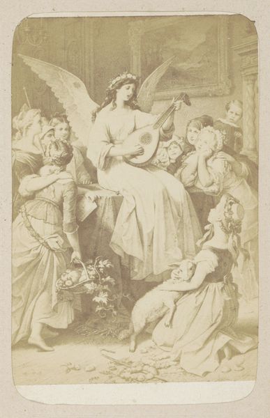 This anonymous photograph captures a scene from Goethe's "Wilhelm Meister's Apprenticeship," rendered in sepia tones. Notice how the composition arranges the figures around a central, winged musician, likely representing Mignon. The framing of the photograph emphasizes the theatrical nature of the scene, the subjects arranged as if on a stage. The photograph’s structure uses light and shadow to create depth, drawing our eye toward the ethereal figure at the center. The contrast between the detailed foreground figures and the softer background adds a sense of ethereal distance, enhancing the scene's symbolic weight. The act of reproduction itself—turning a literary scene into a photograph—invites us to consider the interplay between different forms of representation and how the meaning changes as we transition between them. The photograph thus becomes not just an illustration of a scene but an examination of how art and literature create and reflect our understanding of the world.