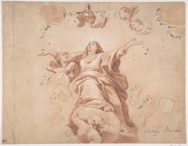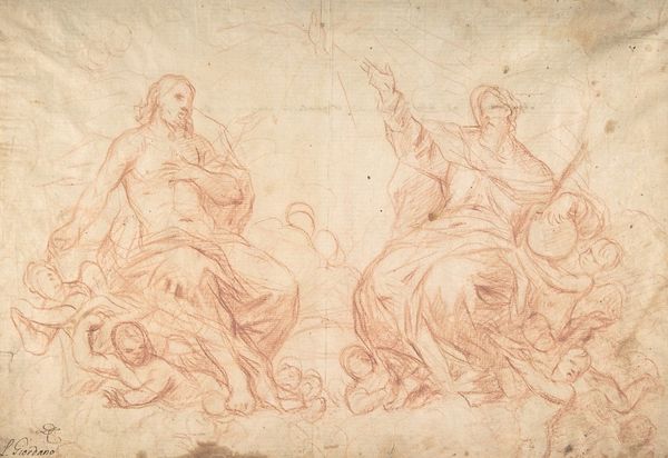 Louis Fabritius Dubourg made this drawing of two allegorical figures using pen and brown ink. We see two women floating on clouds. The figure to the left, bare-breasted, holds a scepter, and a palm frond adorns her head, signs of triumph and authority reminiscent of classical personifications of Victory. The figure to the right prepares to set a crown atop her head, embodying ideals of glory. The act of crowning, a gesture laden with power, has roots stretching back to ancient rituals, seen in the investiture of kings and deities across cultures. It symbolizes the conferral of divine or earthly authority. Think, for example, of coronation ceremonies in medieval Europe or the crowning of statues of the Madonna. Such gestures tap into collective memories, stirring emotions of aspiration and reverence. These motifs invite us to explore how symbols resonate across eras, continuously reborn through the currents of human expression.