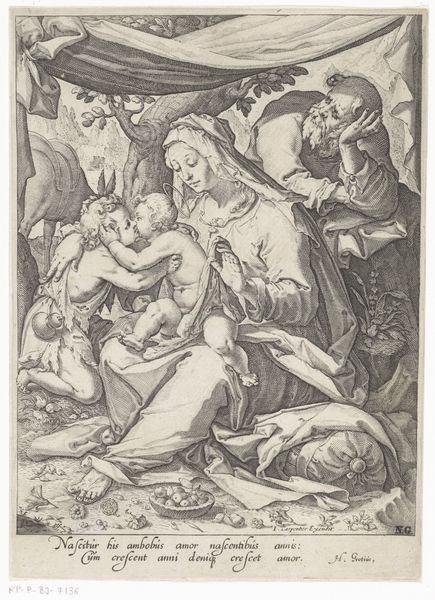 Editor: Here we have "Holy Family," an engraving from the 17th century, currently residing at the Met. The texture achieved through the engraving is incredible, it almost feels like a hazy dream. What catches your eye when you look at this piece? Curator: Beyond the technical skill, I see a concentrated assertion of power, both visible and invisible. Consider the very phrase, "Holy Family." It represents a highly specific power structure. The assumed divine right of kings echoes in this sanctified domestic sphere. Who benefits from the dissemination of this image and the ideologies it presents? Editor: I hadn't thought about it like that, more about religious devotion...but you're right. There's a hierarchy embedded even within this seemingly intimate family scene. How does the artistic style contribute? Curator: The idealized figures, the soft lighting achieved through the engraving—these techniques mask underlying social tensions. Think about the role of women during this period, how their identities were often confined to their roles as mothers and wives. Does the image subvert or reinforce that? Also consider the conspicuous absense. Where is God and what is his place? Editor: So, by glorifying this specific family structure, the artwork subtly reinforces societal expectations and power dynamics, perhaps silencing other forms of familial or societal structures. It becomes more of a political statement, presented as a tender image. I’ll never see ‘holy’ images the same. Curator: Exactly. Art isn't created in a vacuum. Understanding these historical and societal contexts is vital for a critical interpretation. This work presents a carefully constructed narrative; by unpacking it, we are acknowledging its inherent power.