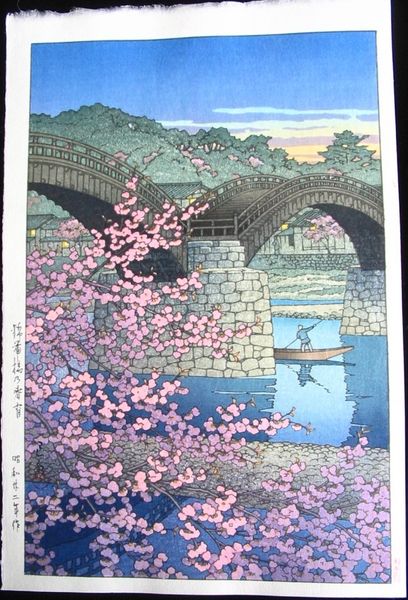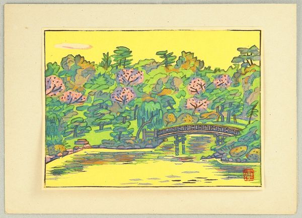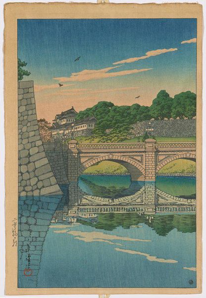 Curator: This woodblock print, titled "Isahaya Spectacles Bridge," was created in 1940 by Unichi Hiratsuka. It offers a unique take on the traditional Ukiyo-e landscape, doesn't it? Editor: It does indeed. It gives off a dreamy, almost nostalgic vibe. I'm drawn to the simplified geometric forms and those soft pastel hues that lend it an almost serene quality, but there's also a loneliness to the scene... like a postcard sent from a memory. Curator: That tranquility might stem from its creation period. Hiratsuka was a key figure in the Sosaku-hanga movement, emphasizing the artist's self-expression over rigid tradition. Look closely and notice the flat areas of color and strong lines— hallmarks diverging from the earlier commercial success and workshop production methods typical in Ukiyo-e. Editor: True, I get the feeling the artist put it out himself. The color isn't overworked, if you know what I mean. Did you notice, that light blue and pale yellow, how they set the stage, the quiet bridge is a sturdy figure—almost a landmark? There are people still using bridges, so it reminds me of movement despite how quiet and peaceful this is. It suggests permanence across generations. Curator: Bridges, especially stone bridges, often function as public monuments in the modern period. I agree that that geometric arrangement contributes heavily, as if a simple reminder to get over oneself. As such, It symbolizes connection, both physically connecting people to each other, of course, but in an ideological context of how these connections can support modernization projects under imperial ambitions. Editor: So you see a touch of government propaganda here too? But to me it whispers of resilience and endurance. All that and also about hope and the chance for progress, whether forced or otherwise. Maybe this art is all the more poignant because those old landscapes feel distant, like something fading into history but this rendition keeps things in tow, too? Curator: It encapsulates complex historical dynamics and changing artistic attitudes just as you say. By combining Ukiyo-e conventions with Sosaku-hanga ideals, it becomes both a celebration of landscape and also the artist’s own subjectivity in this time period. Editor: Beautifully said. Art isn’t ever made in a vacuum. That in itself has so much connection for something seemingly so solitary.