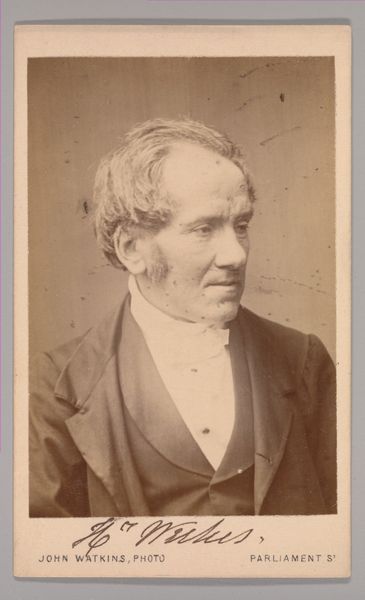 Curator: This photographic print from the 1860s, entitled "[Joseph Durham]", was created by John and Charles Watkins and resides here at The Met. Editor: It's striking. There's an inherent softness to the sepia tones and light pencil work, and how the subject leans contemplatively adds a feeling of introspective quiet. Curator: The image quality is definitely showing the effects of time, but these marks of age almost become part of the material story here. Early photographic processes were laborious, requiring careful attention to chemical preparations and long exposure times. Consider what that means about the access and privilege required to have a portrait made. Editor: Indeed, the image's composition emphasizes a classical balance, almost symmetrical. Light subtly illuminates one side of his face, contrasting gently with the shadows—beautiful chiaroscuro that enhances his refined features. Curator: Watkins' studio operated during a fascinating period, when photography was quickly transitioning from a novelty to a powerful means of representation. Portraiture democratized the visual language. Even a professional like Joseph Durham, with likely strong ties to industry, gains new visual importance when immortalized and shared through the print form. Editor: Yes, beyond its material status as photograph and the representation it allows, there's a strong evocation of character achieved through the details captured in his expression and attire—suggesting both refinement and world-weariness. Curator: Knowing this was intended to be reproduced as an inexpensive portrait certainly contextualizes that refined expression! Thanks to its materiality, Durham becomes infinitely reproducible, entering the stream of photographic history. Editor: An intriguing print—formally compelling, but made so much richer when grounded in history and the understanding of production. Curator: Precisely! Recognizing photography’s democratizing potential is paramount in interpreting its cultural resonance during the 19th Century and to this very day.