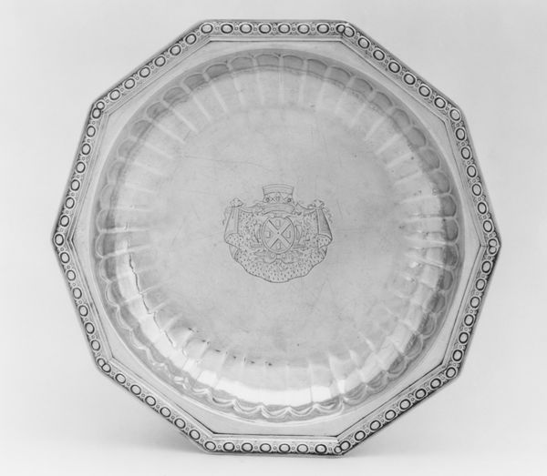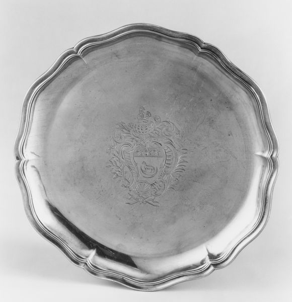 Curator: Here we have a silver platter, part of a larger set created by Jacques Bernier between 1786 and 1788. These pieces offer a glimpse into the lavish table settings of the late 18th century. Editor: My immediate impression is one of restrained elegance. The smooth, reflective surface, the gentle curves—it evokes a sense of formality, but without the overwhelming ornamentation you often see. It is almost meditative in its simplicity. Curator: That reflects the burgeoning Neoclassical style. Bernier was working at a time when the French aristocracy were embracing a more sober aesthetic, partly as a reaction against the excesses of the Baroque period and as the winds of social change were beginning to pick up speed. Editor: The crown emblem at the top certainly tells a story of status and power. In its symbolic vocabulary, the platter embodies an ideal of monarchy blessed with serenity and stability, like a calm sea, if I may say so. I think the undulating edges adds to the feeling of waves. Curator: Precisely! These weren’t just utilitarian objects. They were potent signifiers, communicating wealth, taste, and belonging to a very specific social class. Notice, also, how these platters were made in graduated sizes as part of a wider movement of organizing table culture and dining customs during the ancien regime. Editor: Did each size have a designated food, some assigned symbolic role at the table? Curator: Potentially! Contemporary etiquette dictated very specific arrangements and presentation. Each dish and each course served to enhance the meal as both gastronomic and social performance, and I bet there was significance ascribed to the hierarchy and arrangement of sizes here. Editor: Food itself is, of course, incredibly symbolic, so everything would have contributed to the experience. When looking at the symbolism, though, one has to take into account that they speak on several layers—on a class-based level of access to power but also on personal level of experience around the meal and what it stood for, consciously or not. Curator: Right, and understanding the cultural context illuminates the piece far beyond its monetary worth as an object of precious metal. Editor: Absolutely. Analyzing symbols reveals not just the history, but also our shared and subconscious responses to them over time. It almost looks like something delicious should be served on it to be worthy!