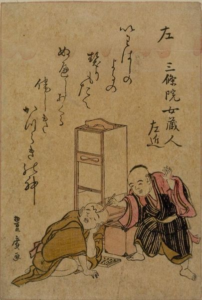 Editor: This is "Children at Play" by Utagawa Toyohiro. I am really drawn to the texture of the paper and the muted colors. What elements stand out to you? Curator: Indeed. Notice how the composition is structured by the interplay of line and plane. The calligraphic strokes above counterpoint the figural representation below, creating a dynamic tension. Editor: That's a good point, I missed that. What does the placement of text add to the image? Curator: The vertical lines of text create a visual rhythm, mirroring the verticality of the figures and adding to the overall textural complexity. Consider how the artist uses the negative space, particularly around the figures, to draw the eye. Editor: The texture and the layering of elements definitely create a visually stimulating surface. I appreciate you pointing out the spatial dynamics.