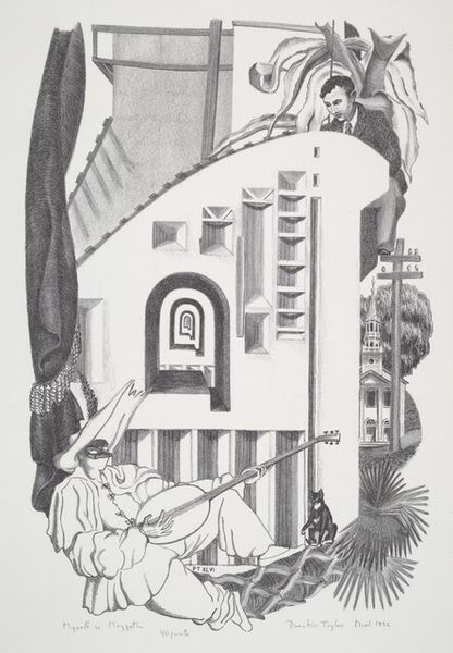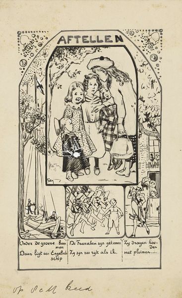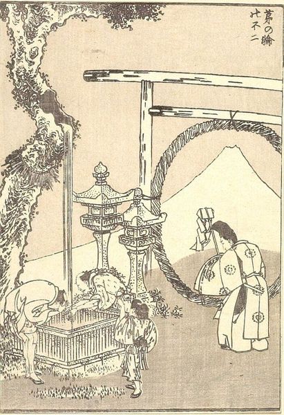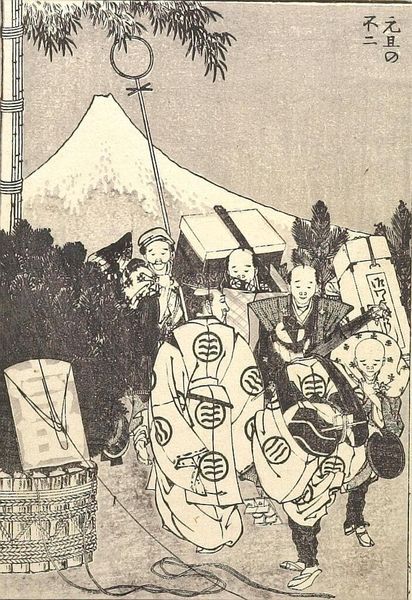 Curator: Hokusai's "Fuji at a Village Boundary," is one plate from his *One Hundred Views of Mount Fuji*. I'm struck by the clever framing. Editor: Yes, the composition is fascinating. The stark monochrome woodblock printing creates an atmosphere of bustling activity juxtaposed with serene stillness. Curator: Consider how the figures, rendered with intricate linework, are dwarfed by the majestic Fuji. This reflects the mountain's cultural significance as a symbol of permanence. The village boundary with the pole and the sacred paper decorations is also very important. Editor: That's interesting, but I am fascinated by the contrast between geometric precision and the organic forms of the trees. The use of positive and negative space also creates a dynamic visual rhythm. Curator: I agree, but don't you think that the scene gives us insight into the lives of ordinary people during this period and how important rituals were to the society? Editor: Yes, yes, but I am just taken by the mastery of form and line. It's a wonderful example of how reduction can amplify impact. Curator: I find myself equally drawn to the historical context and the artist’s masterful execution. Editor: Indeed, it's a testament to the power of art to condense both the aesthetic and the cultural into a single image.