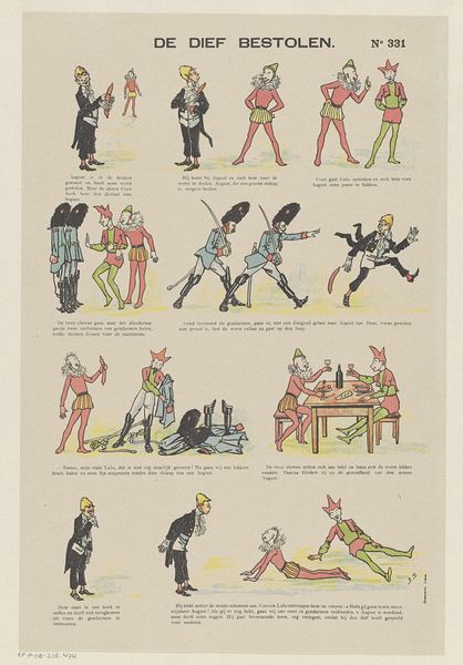 Editor: This mixed-media lithograph, "De geschiedenis van een scheepsjongen" or "The History of a Cabin Boy," was created by Rougeran Vignerot sometime between 1876 and 1890. The scenes and caricatures feel very much like illustrations in a children's story, yet some of the imagery is unsettling. How do you interpret this work? Curator: Indeed, there’s a discomfort that sits with the bright colours and playful presentation. Look closely at how people of colour are depicted in contrast to the white cabin boy. Considering this was produced during a period of intense colonialism, how might Vignerot's choices in representation reflect or challenge the power dynamics of the time? Editor: That’s a perspective I hadn't considered. The exaggerated features and darker skin tones now strike me as clear caricatures, seemingly perpetuating harmful stereotypes. It makes the overall narrative deeply problematic. Curator: Precisely. It’s crucial to examine the historical context and consider how this imagery may have contributed to a dehumanizing gaze toward colonized people. The seemingly innocent "history" becomes a commentary on the perceived social hierarchy. Do you see the power dynamics represented formally in the piece as well? Editor: Now that you point it out, yes. The figures of colour are often smaller and are literally and figuratively ‘beneath’ the central white figure of the boy, and in subservient roles. This changes everything about how I see this lithograph. Curator: Exactly. Art isn't created in a vacuum, and understanding its connection to social structures can unveil the politics embedded within even the most aesthetically pleasing piece. Editor: This has made me think a lot about the responsibility of artists and how their work can inadvertently perpetuate inequalities. Curator: And the importance of our critical engagement with it. By questioning what we see, we empower ourselves to dismantle the ideologies embedded in art.